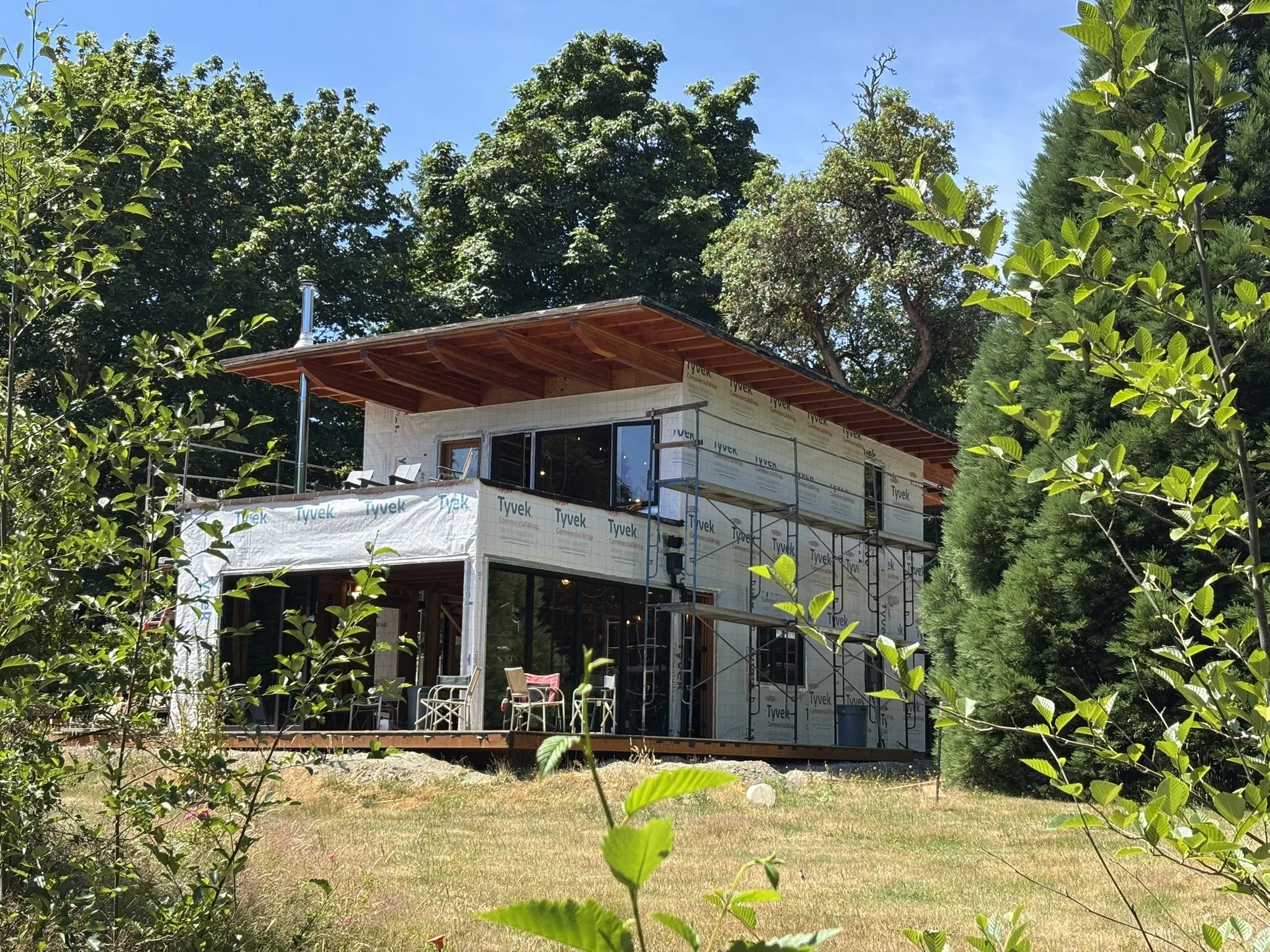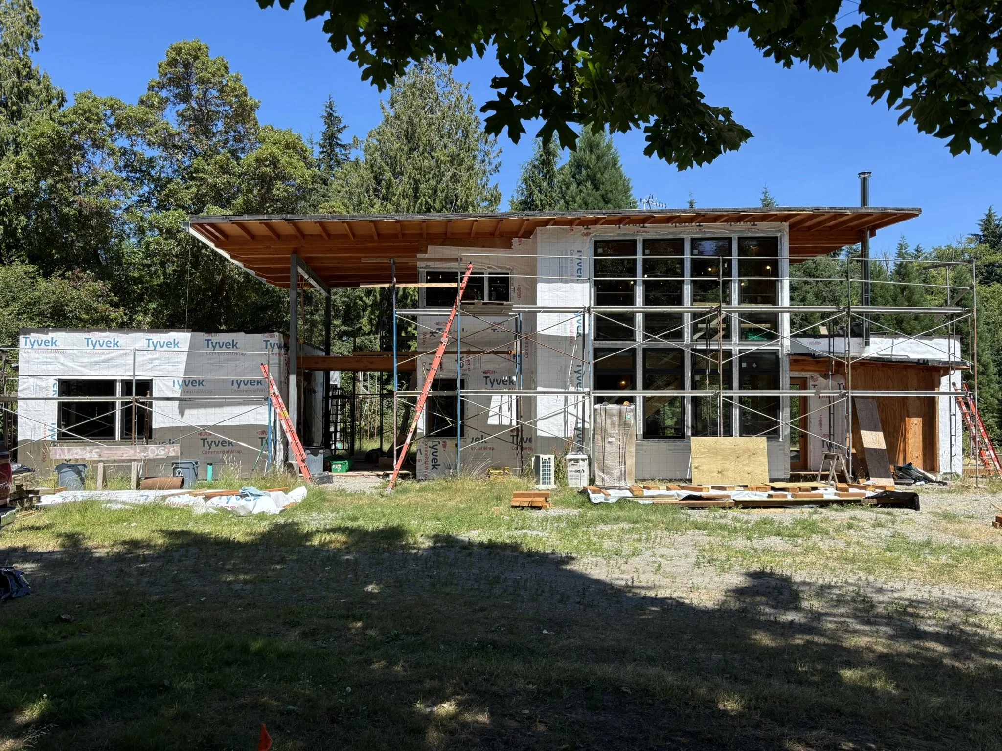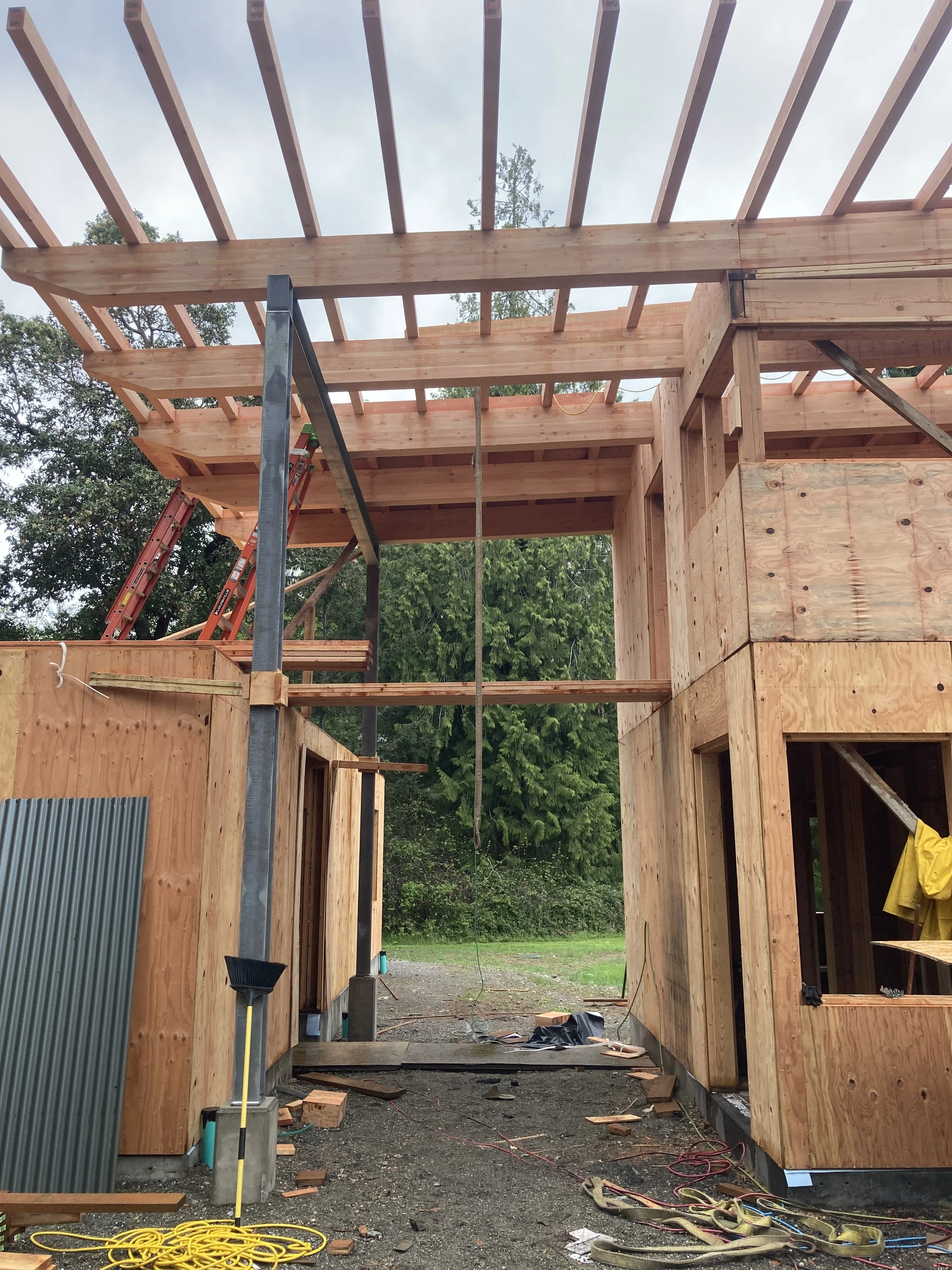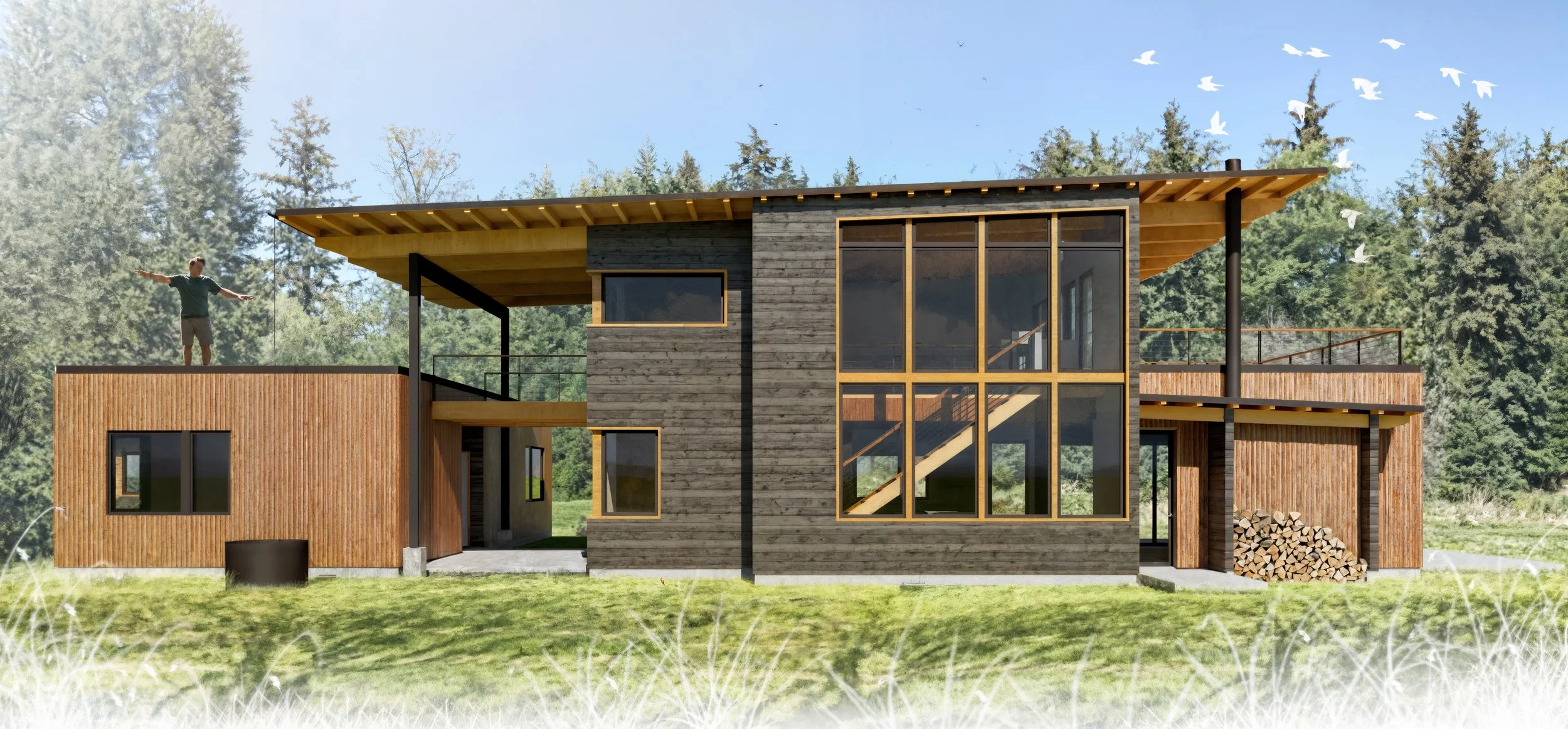 Set among the trees on Vashon Island, Dockton House rises quietly from a forest clearing. The home is composed of two distinct wings — a living block and a sleeping nest — connected by the sheltered entry breezeway where light and air pass freely through. The living wing, with its generous shed roof, houses the family’s shared spaces, while the quieter sleeping wing tucked near the forest edge offers refuge and privacy. The structural system combines wood and steel with glulam beams and doug fir purlins extending beyond the envelope to create deep eaves and covered decks. At the interior the exposed floor and roof structure create a harmonious rhythm over one’s head and light that filters through the trees and into the building play shadows across surfaces. Cedar and steel mark the contrast between shelter and exposure, each aging in harmony with the island climate. Radiant concrete slab floors and energy efficient mini splits ensure comfort year round. A green roof and solar ready flat roof over the sleeping nest enhance sustainability while the material palette — warm wood siding for the living wing and durable metal for the sleeping nest — express the dual nature of the program. Dockton House is a study in balance: between wood and metal, openness and quiet, land and sky.