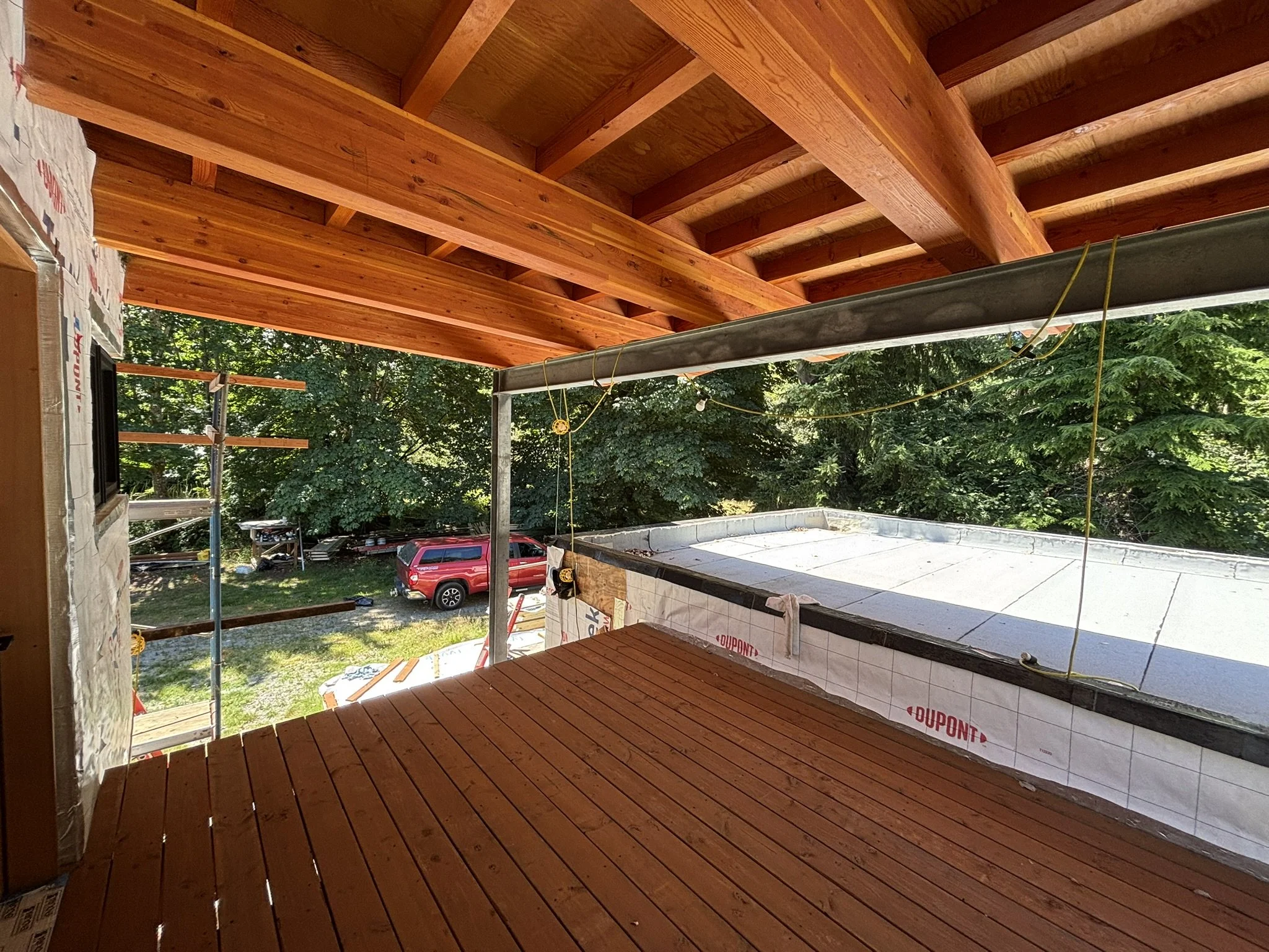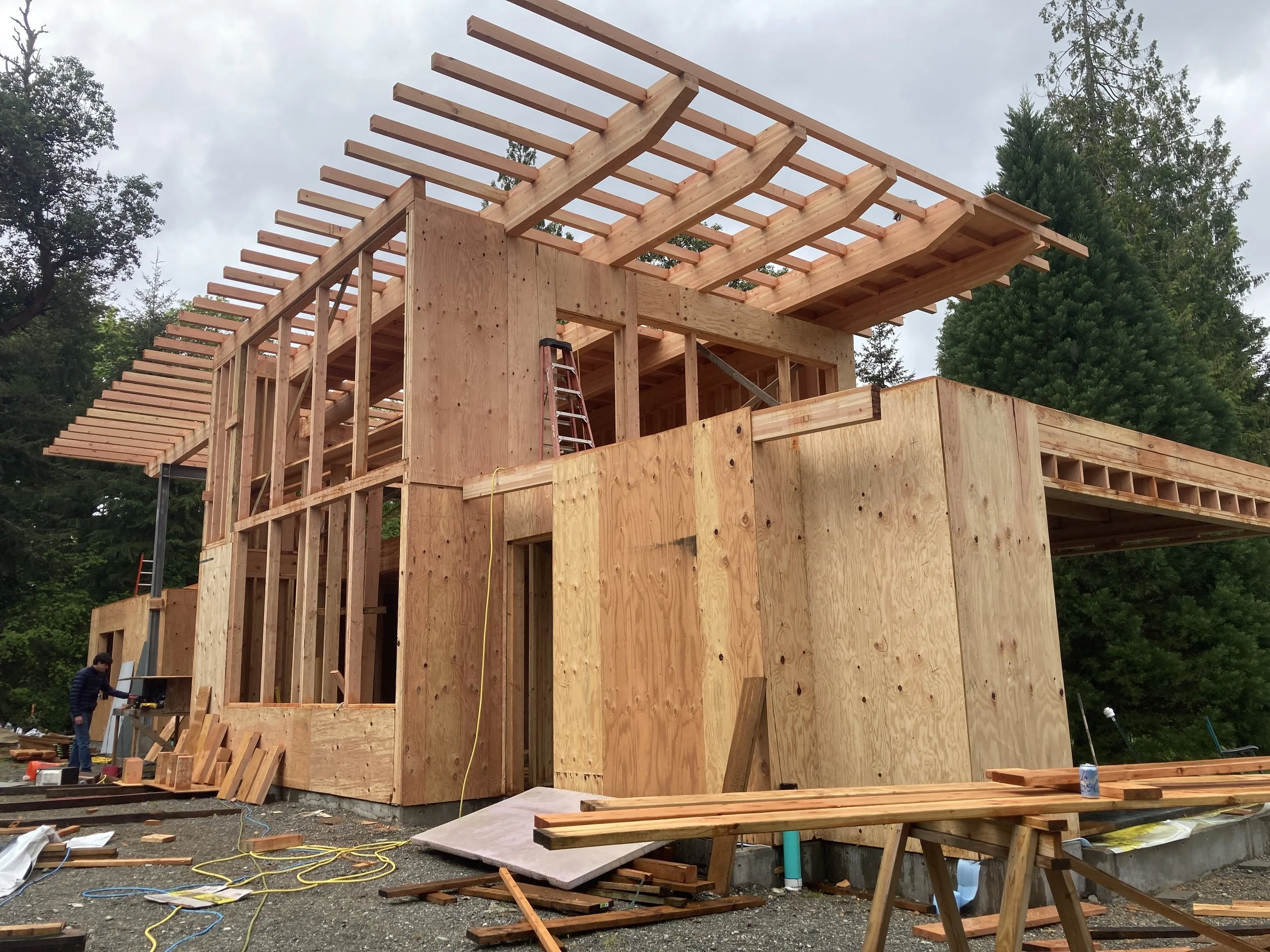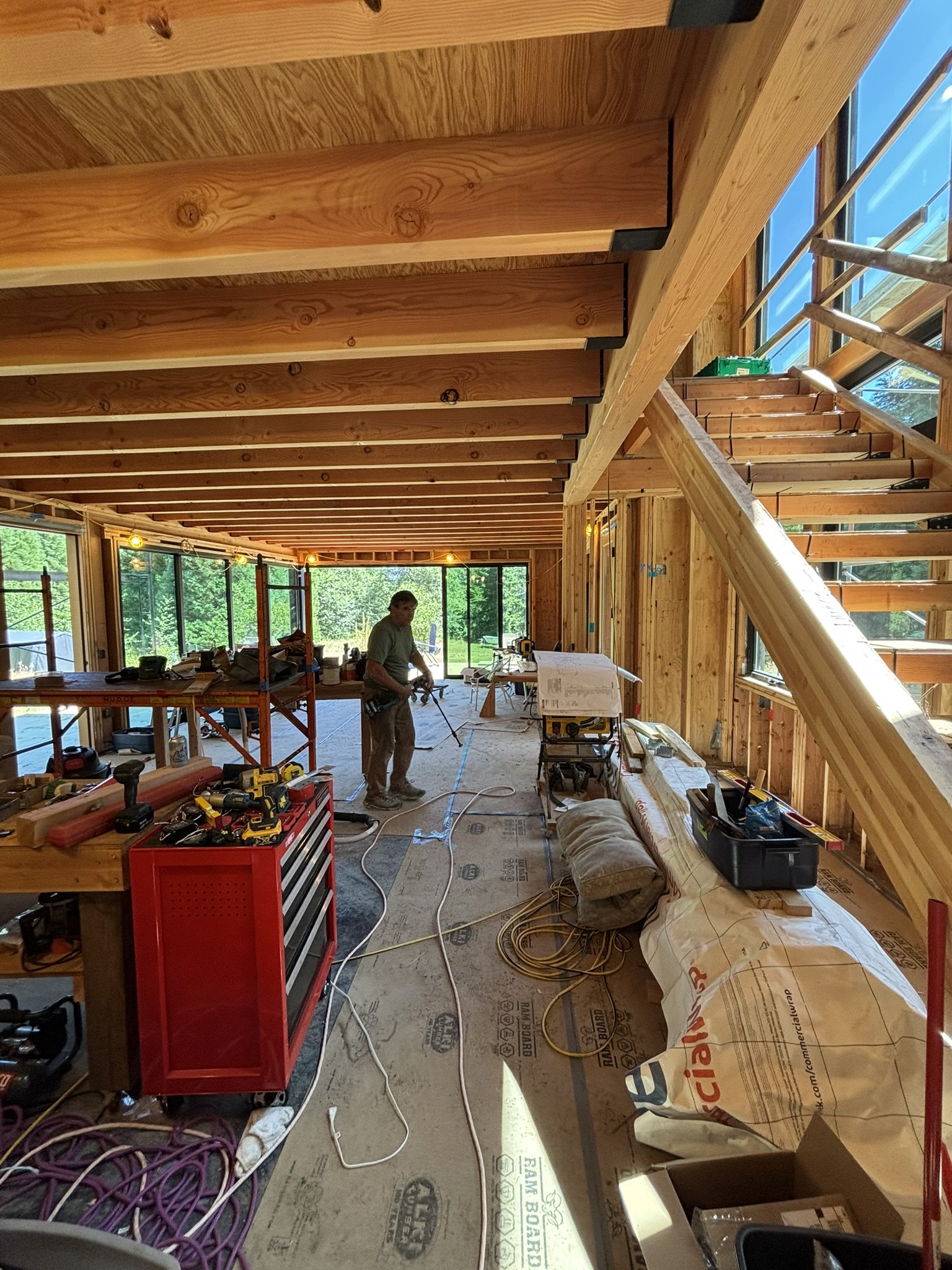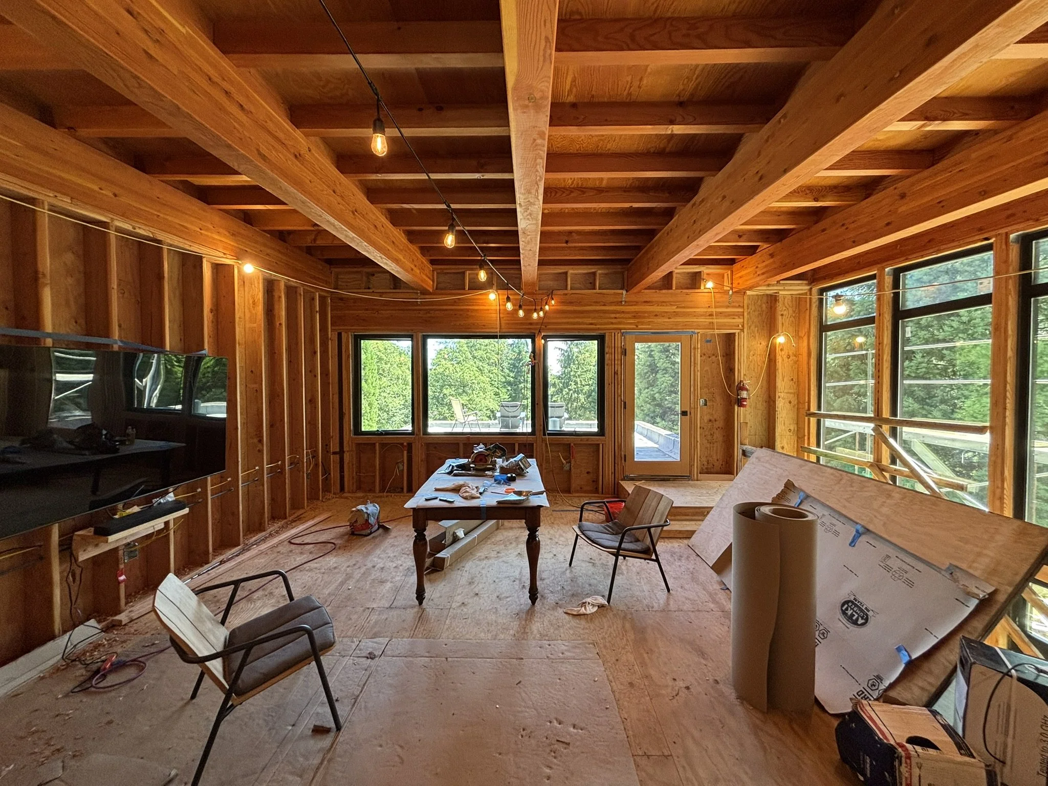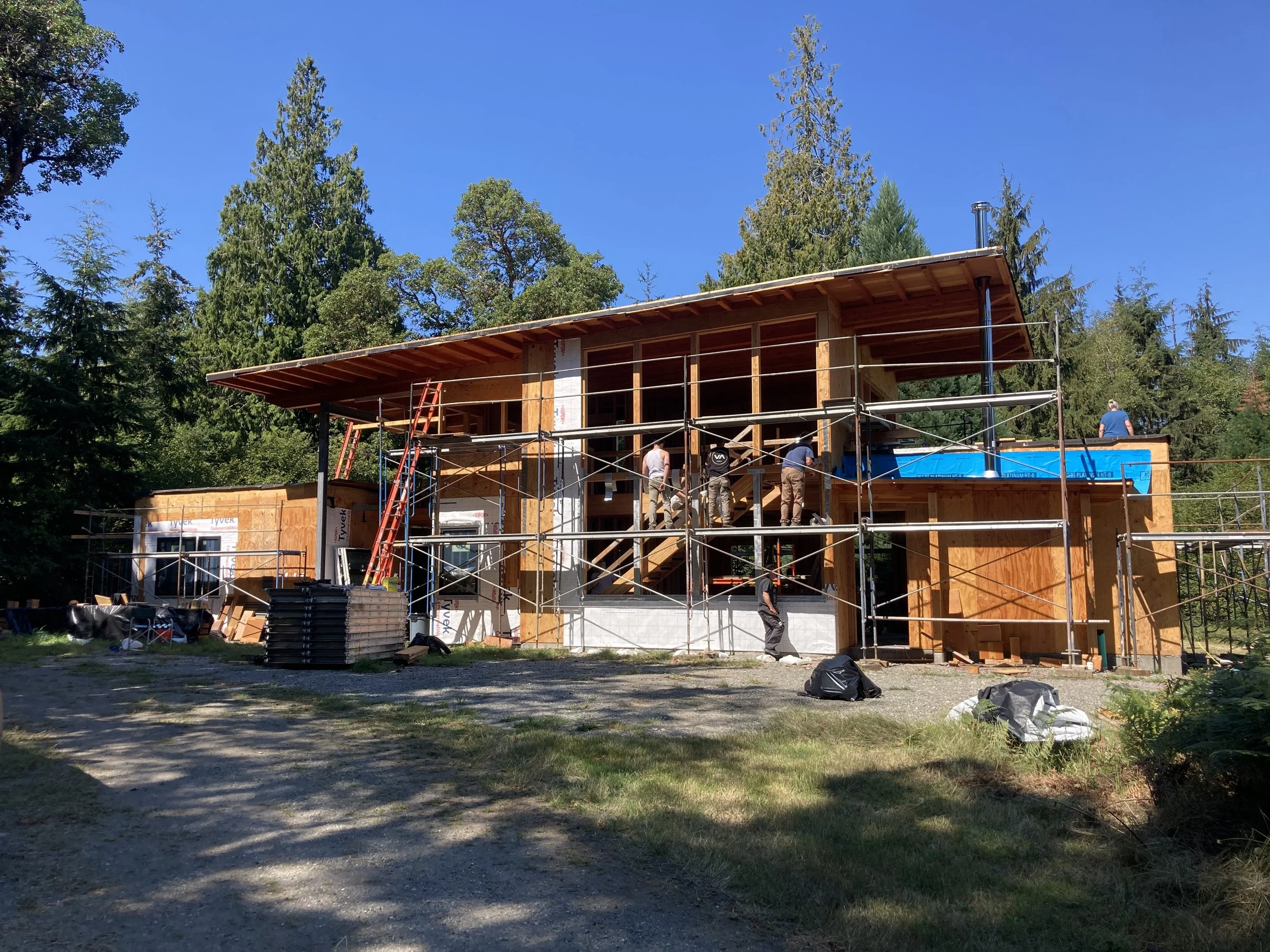 Set among the trees on Vashon Island, Dockton House rises quietly from a forest clearing. The home is composed of two distinct wings — a living block and a sleeping nest — connected by the sheltered entry breezeway where light and air pass freely through. The living wing, with its generous shed roof, houses the family’s shared spaces, while the quieter sleeping wing tucked near the forest edge offers refuge and privacy. The structural system combines wood and steel with glulam beams and doug fir purlins extending beyond the envelope to create deep eaves and covered decks. At the interior the exposed floor and roof structure create a harmonious rhythm over one’s head and light that filters through the trees and into the building play shadows across surfaces. Cedar and steel mark the contrast between shelter and exposure, each aging in harmony with the island climate. Radiant concrete slab floors and energy efficient mini splits ensure comfort year round. A green roof and solar ready flat roof over the sleeping nest enhance sustainability while the material palette — warm wood siding for the living wing and durable metal for the sleeping nest — express the dual nature of the program. Dockton House is a study in balance: between wood and metal, openness and quiet, land and sky.