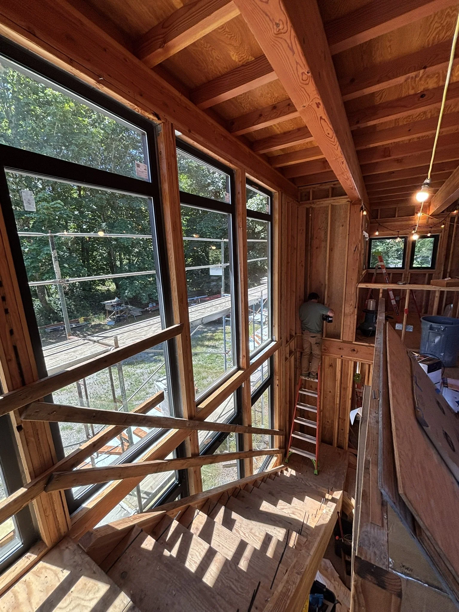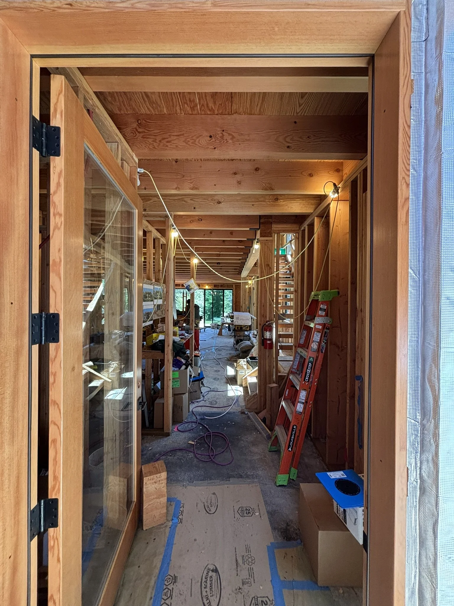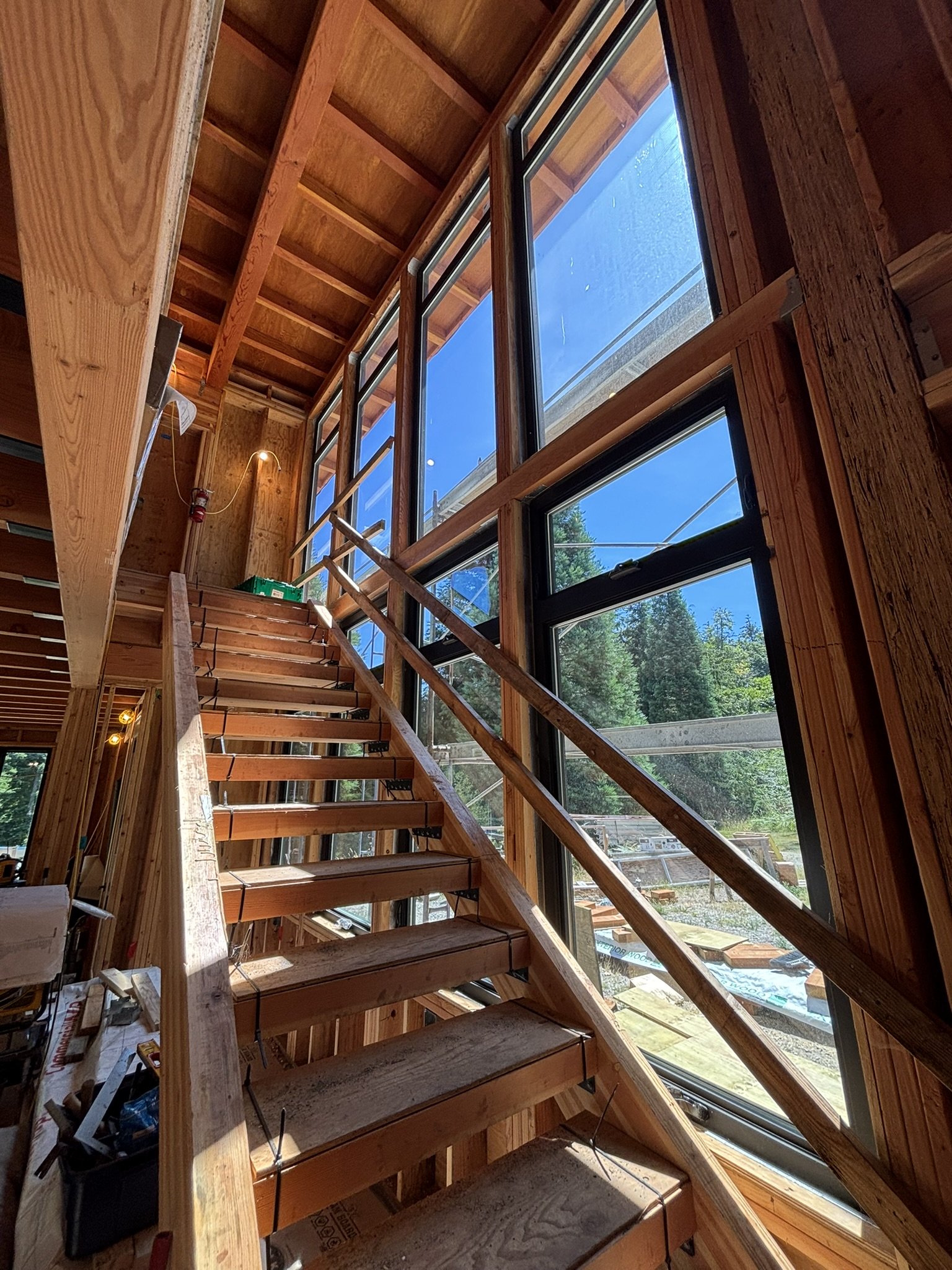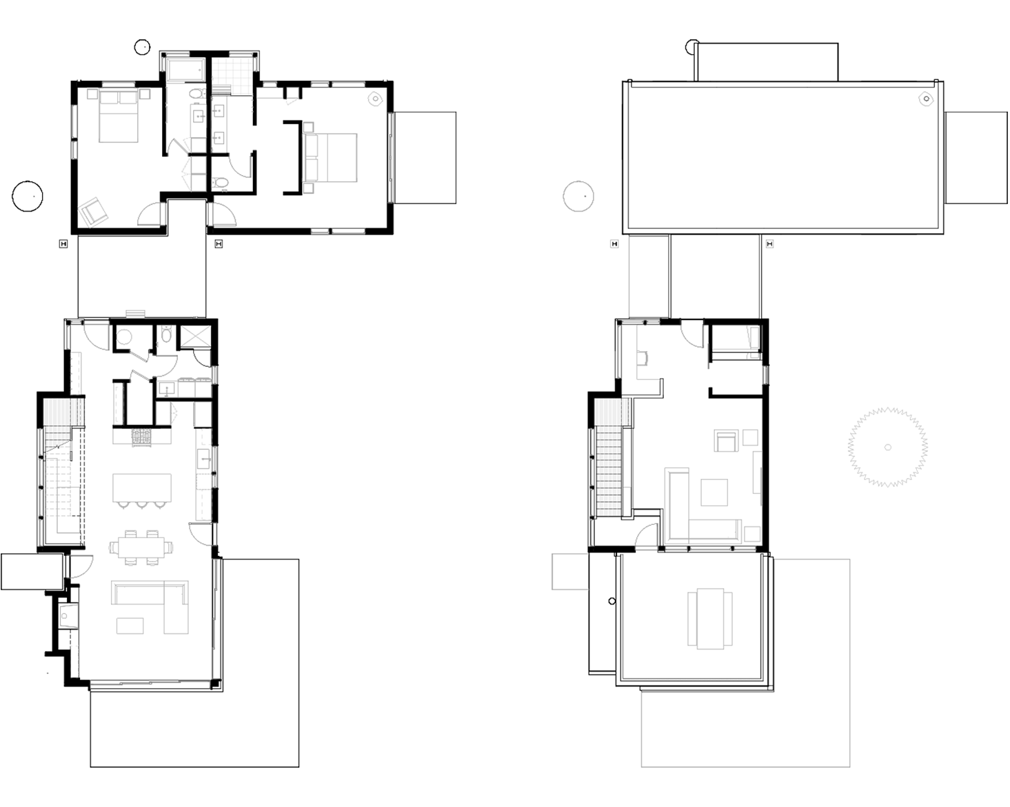 Set among the trees on Vashon Island, Dockton House rises quietly from a forest clearing. The home is composed of two distinct wings — a living block and a sleeping nest — connected by the sheltered entry breezeway where light and air pass freely through. The living wing, with its generous shed roof, houses the family’s shared spaces, while the quieter sleeping wing tucked near the forest edge offers refuge and privacy. The structural system combines wood and steel with glulam beams and doug fir purlins extending beyond the envelope to create deep eaves and covered decks. At the interior the exposed floor and roof structure create a harmonious rhythm over one’s head and light that filters through the trees and into the building play shadows across surfaces. Cedar and steel mark the contrast between shelter and exposure, each aging in harmony with the island climate. Radiant concrete slab floors and energy efficient mini splits ensure comfort year round. A green roof and solar ready flat roof over the sleeping nest enhance sustainability while the material palette — warm wood siding for the living wing and durable metal for the sleeping nest — express the dual nature of the program. Dockton House is a study in balance: between wood and metal, openness and quiet, land and sky.