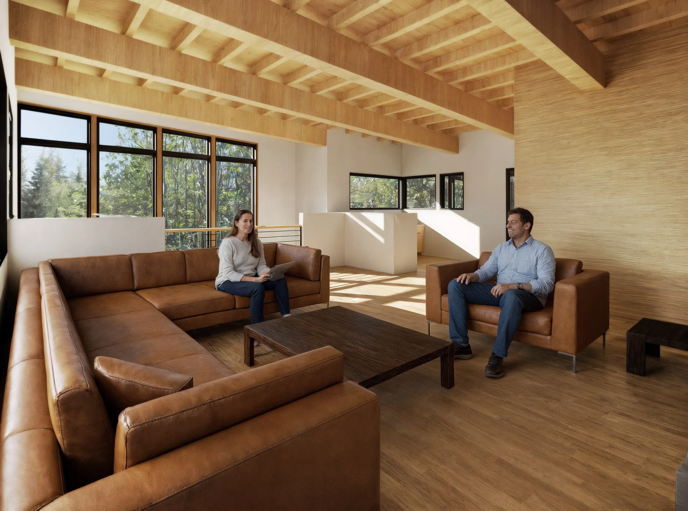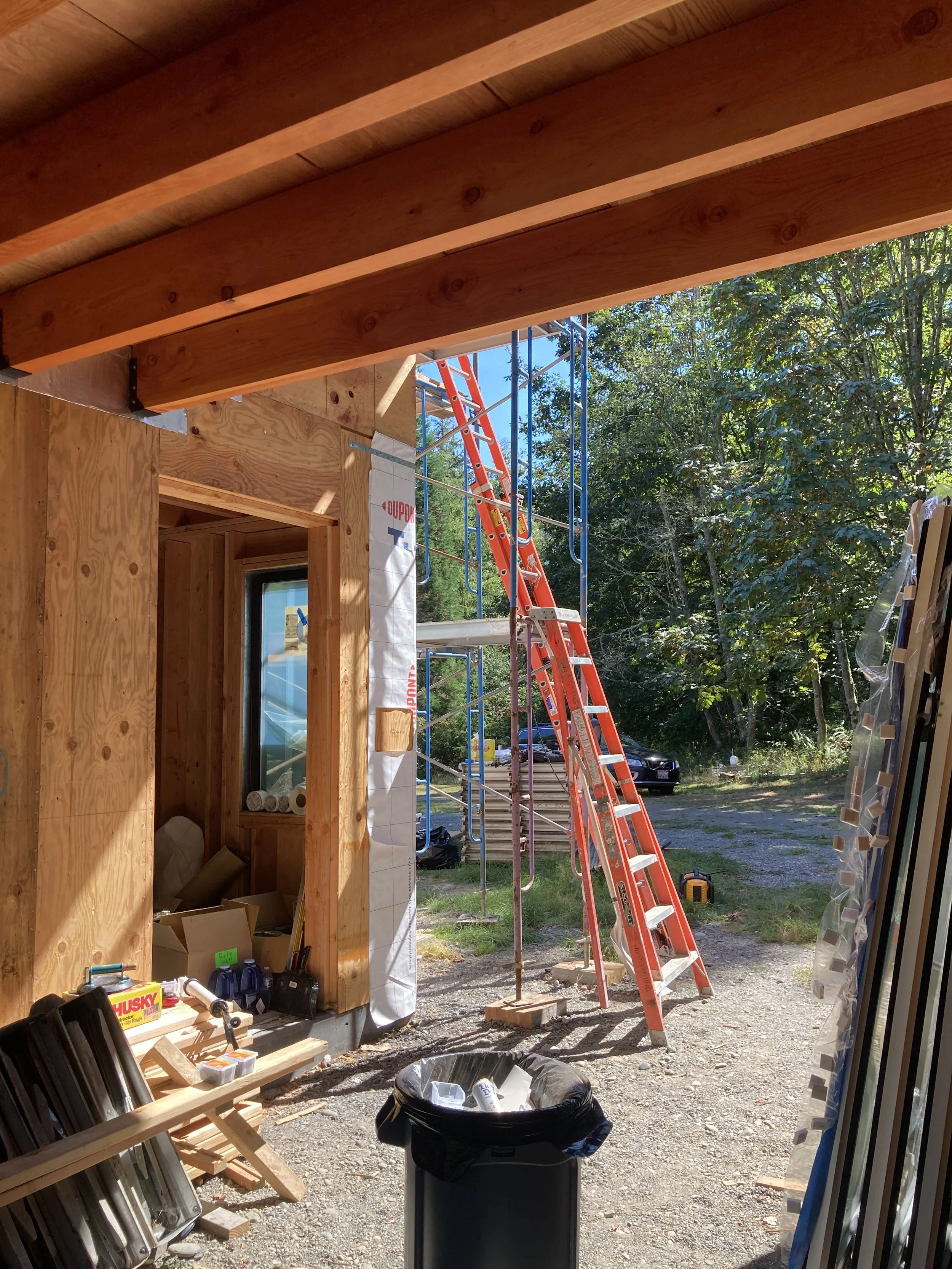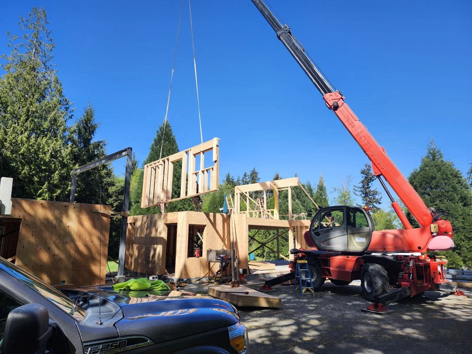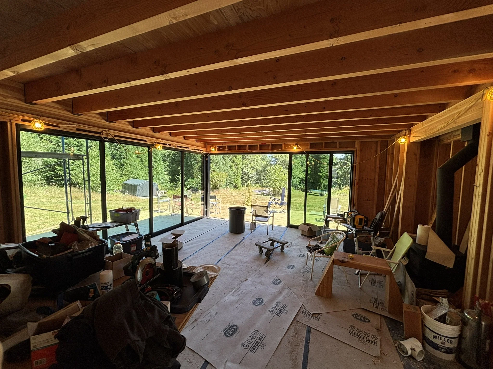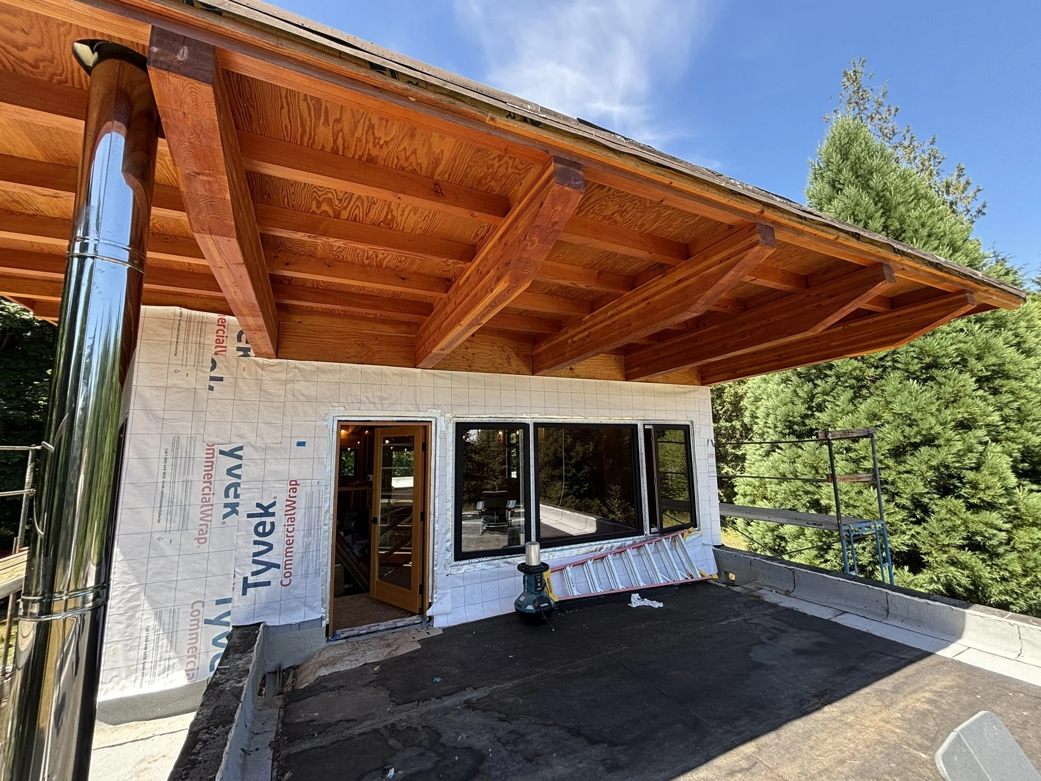 Set among the trees on Vashon Island, Dockton House rises quietly from a forest clearing. The home is composed of two distinct wings — a living block and a sleeping nest — connected by the sheltered entry breezeway where light and air pass freely through. The living wing, with its generous shed roof, houses the family’s shared spaces, while the quieter sleeping wing tucked near the forest edge offers refuge and privacy. The structural system combines wood and steel with glulam beams and doug fir purlins extending beyond the envelope to create deep eaves and covered decks. At the interior the exposed floor and roof structure create a harmonious rhythm over one’s head and light that filters through the trees and into the building play shadows across surfaces. Cedar and steel mark the contrast between shelter and exposure, each aging in harmony with the island climate. Radiant concrete slab floors and energy efficient mini splits ensure comfort year round. A green roof and solar ready flat roof over the sleeping nest enhance sustainability while the material palette — warm wood siding for the living wing and durable metal for the sleeping nest — express the dual nature of the program. Dockton House is a study in balance: between wood and metal, openness and quiet, land and sky.