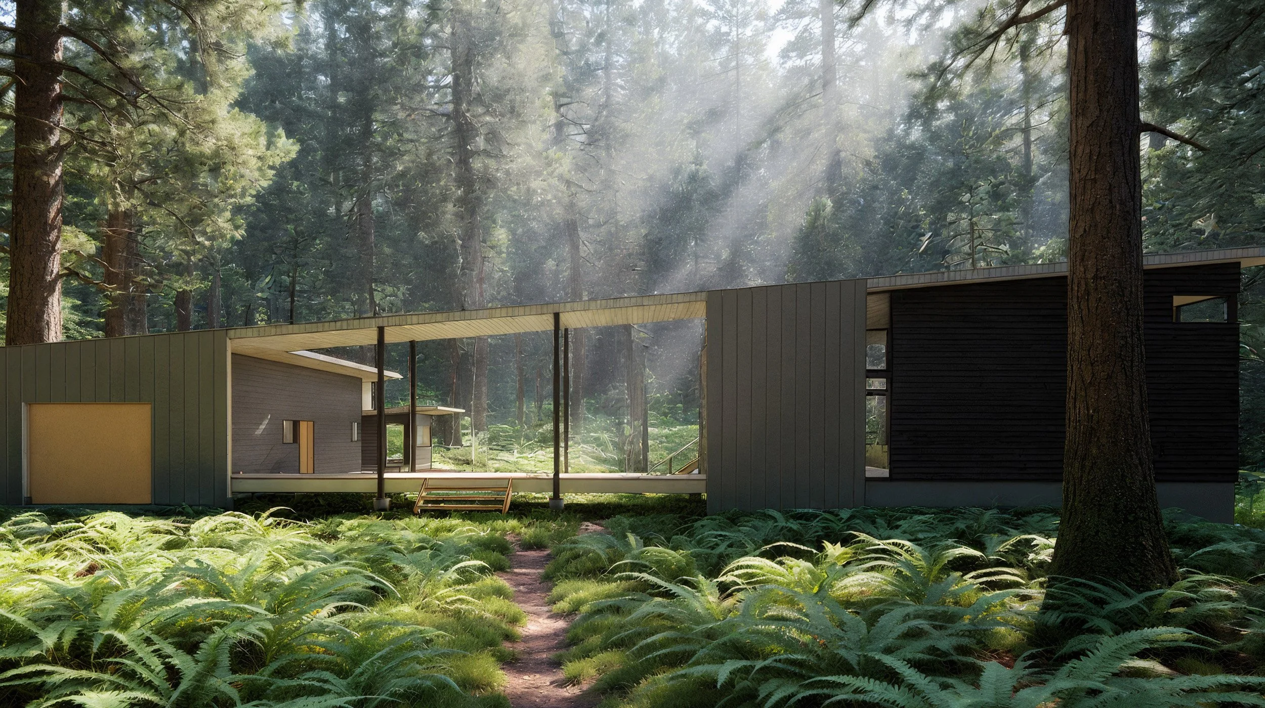 Among cedars and redwoods, Jenner Cabin rests quietly on the edge of a ravine, poised between ground and canopy. The approach is understated — a path, a bridge, a rise — before the forest opens and the cabin reveals itself in light and timber. Its long, lean form traces the contour of the land, its roof stretching outward as a gesture of protection. Traditional wood framing and selective steel structure support the broad roof above. Inside the air is warm with wood and filtered sun and the distinction between shelter and wilderness fades. A durable metal roof and cladding form a weatherproof shell while the interior’s warm wood finishes create a sense of softness and retreat. Jenner Cabin is a sanctuary not from the forest, but within it — a place where simplicity, quiet, and craft align with the calm of the land itself.