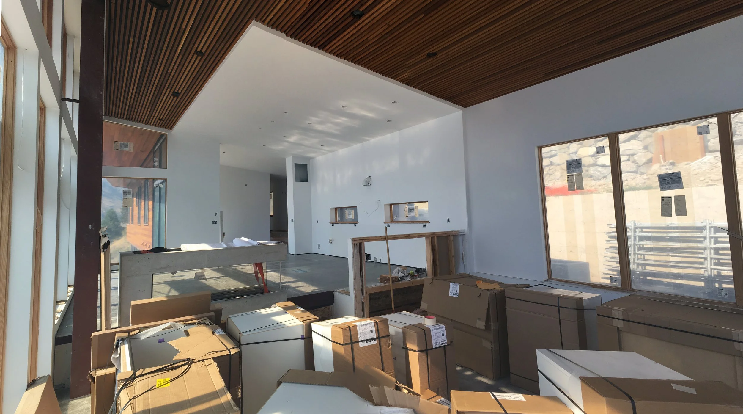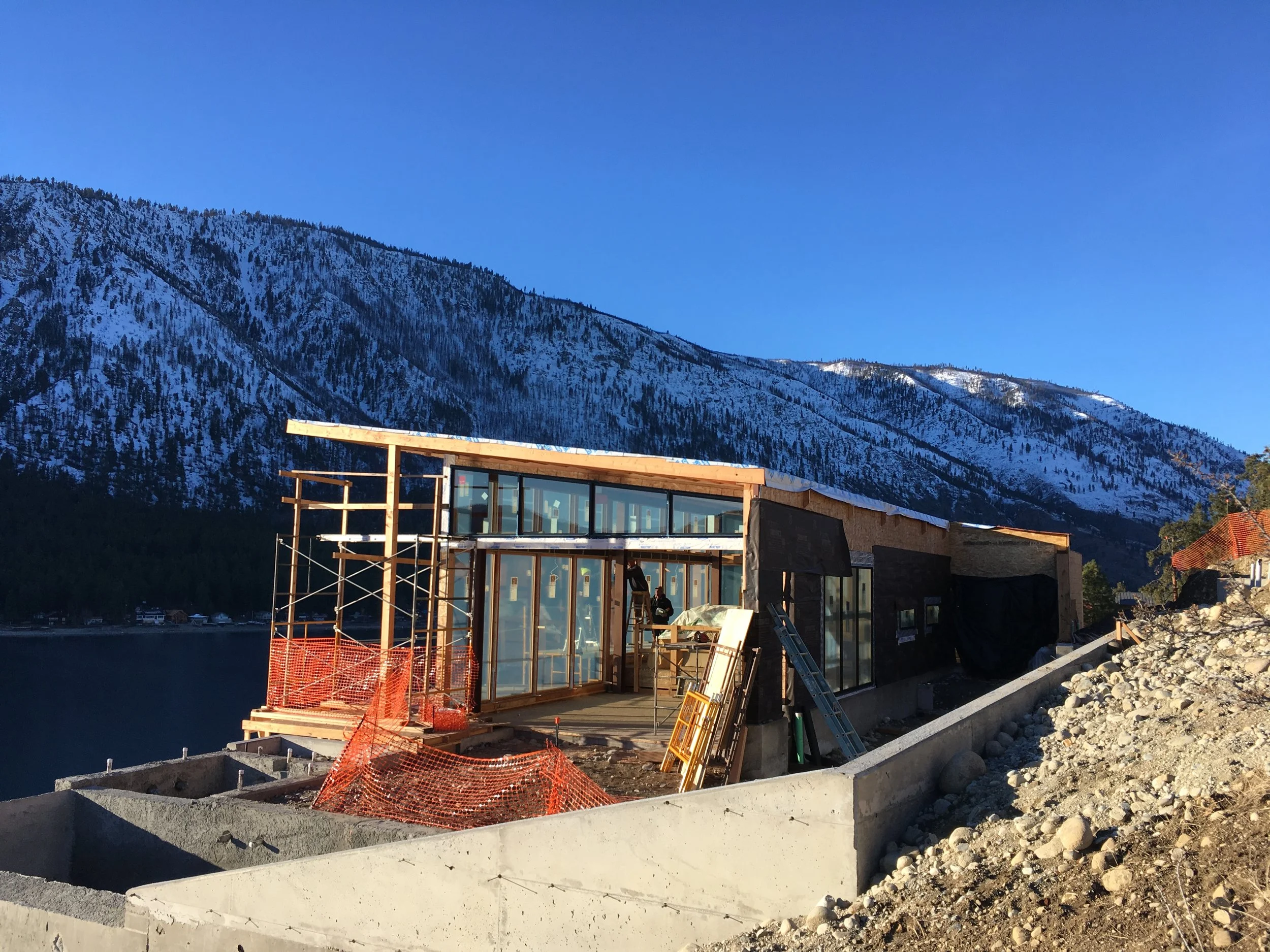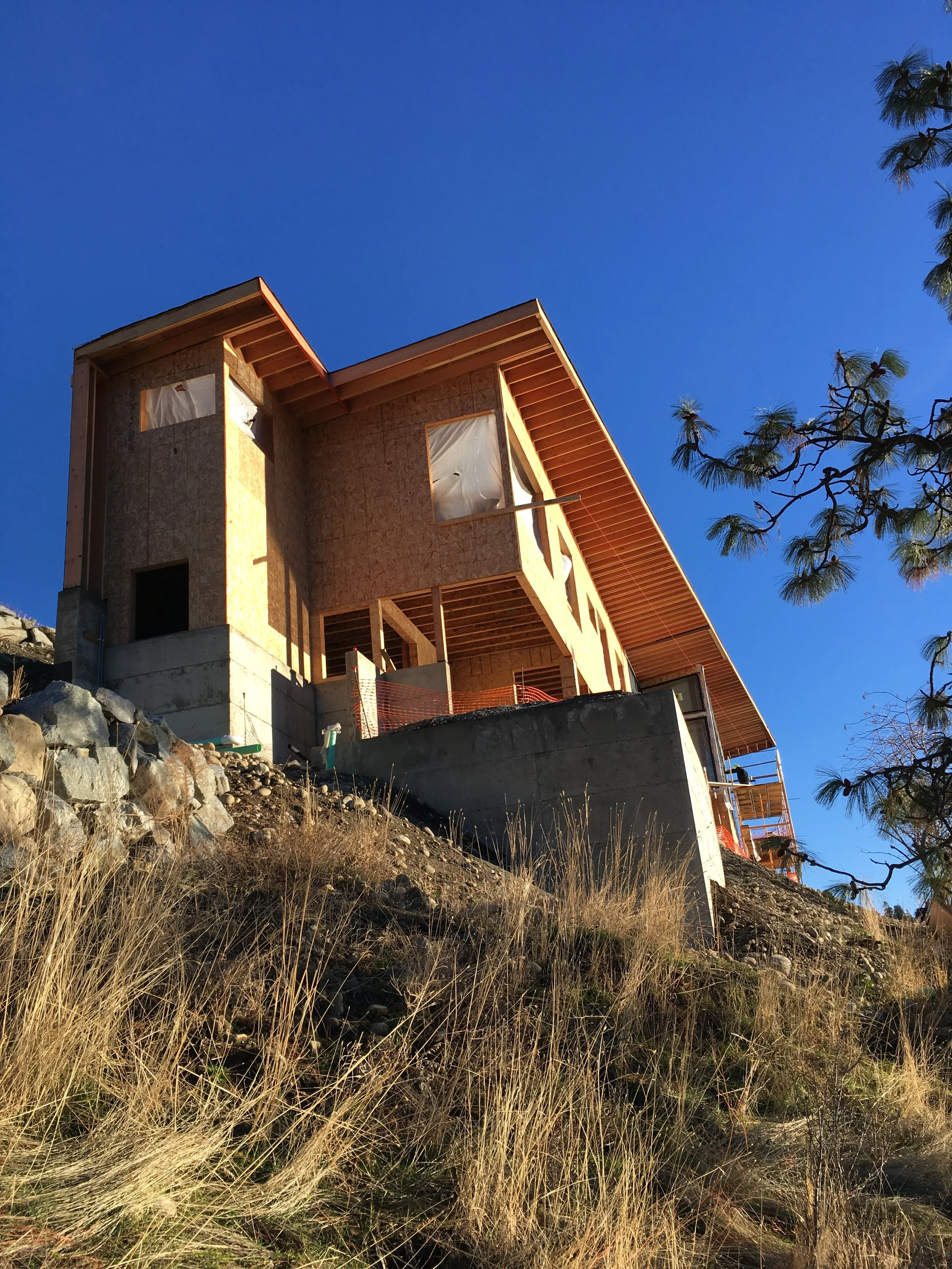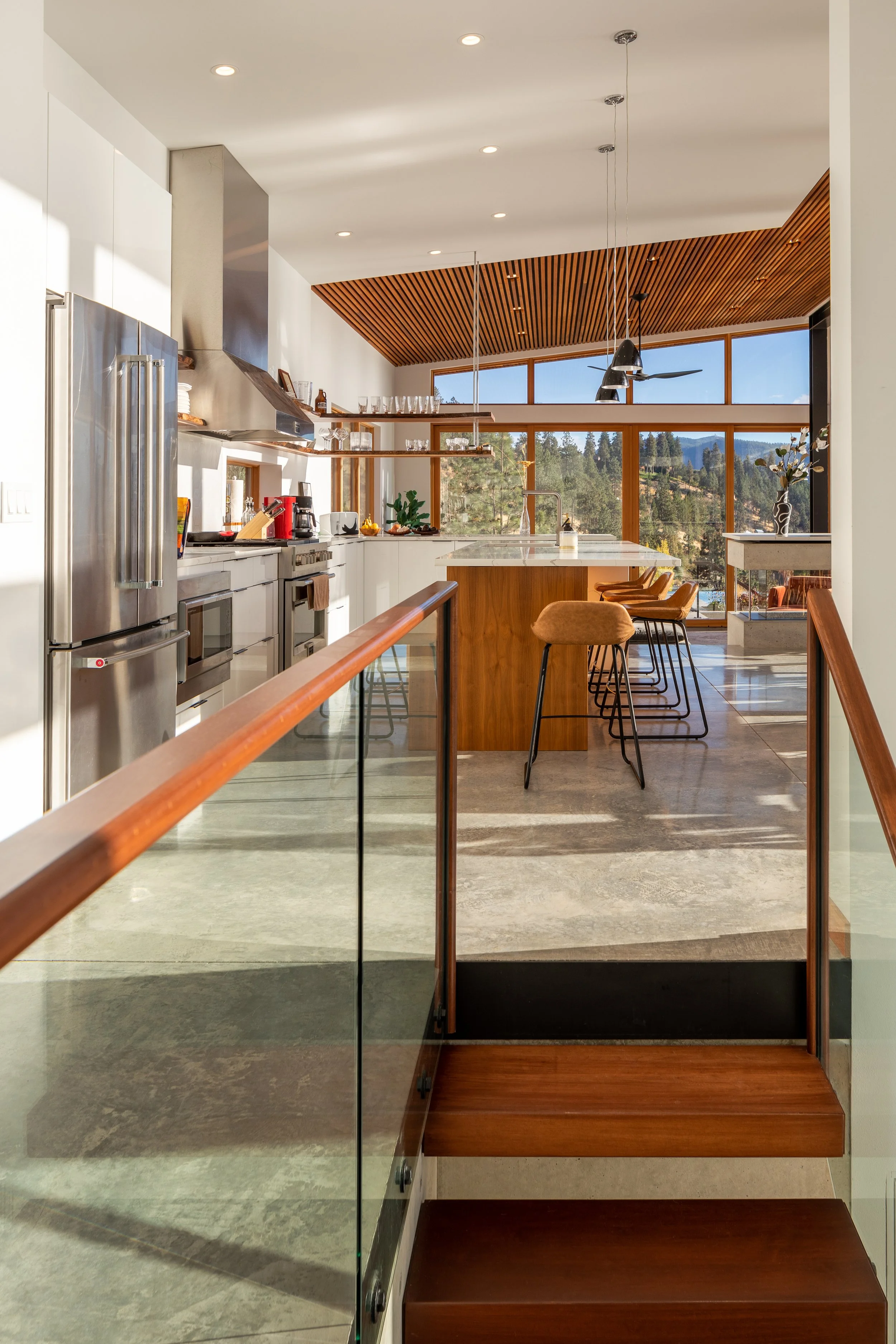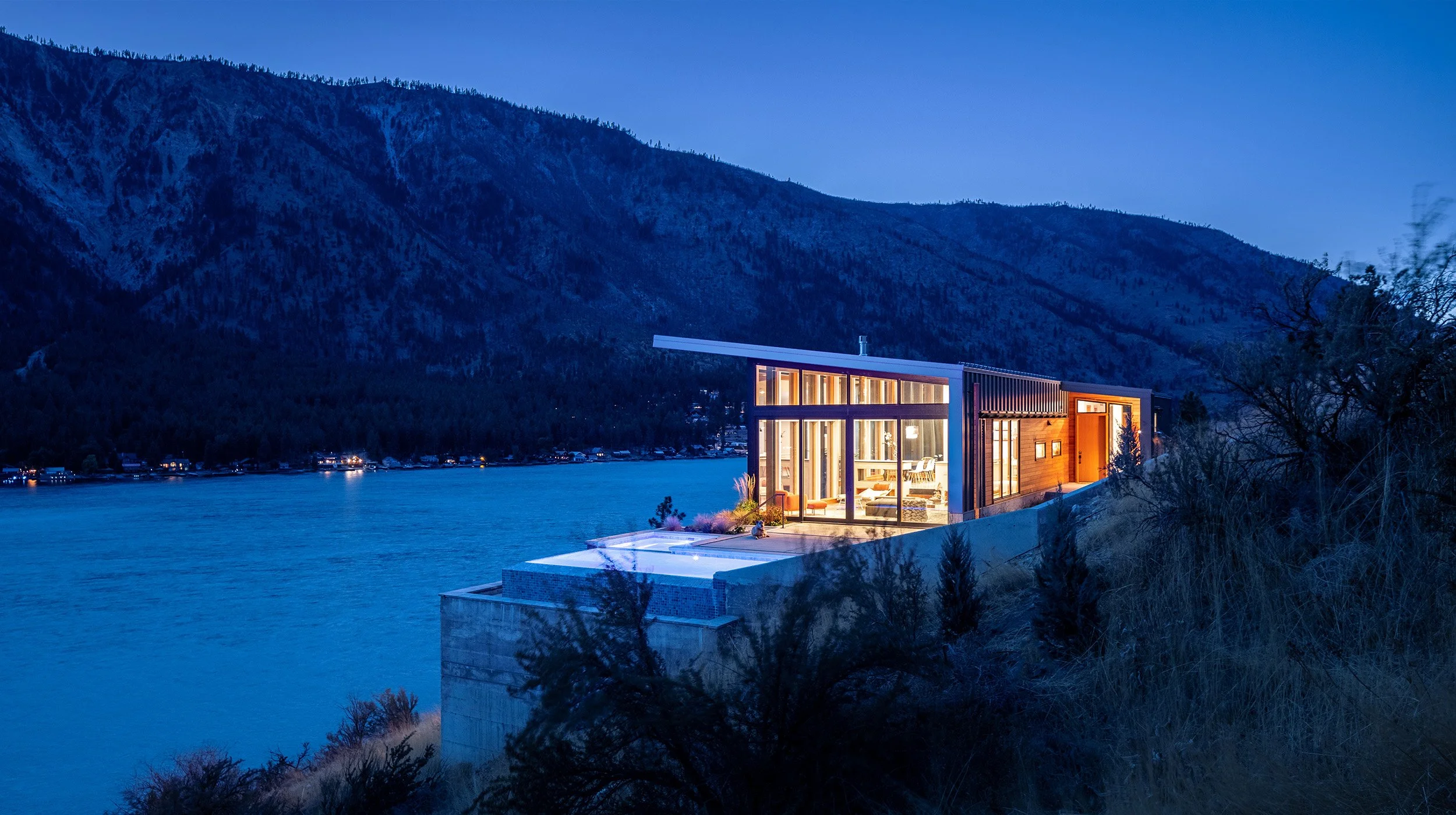 Poised above Lake Chelan, this house settles into the hillside rather than standing upon it. Its form follows the slope, allowing movement through the home to echo the rhythm of the land itself. On approach, the roof folds downward touching the earth in a quiet gesture of humility before opening toward the expanse of water and sky. Inside light and view unfold as a sequence of discovery, the terrain guiding each step, the architecture framing moments of pause. Deep eaves trace the sun’s arc, sheltering glass walls that dissolve the boundary between interior and landscape. Materials of the Northwest — metal, cedar, and concrete — are composed in balance: cool and protective on the exterior, warm and tactile within. The result is a home that doesn’t dominate its setting but amplifies its stillness, its reflection, and its sense of place.
