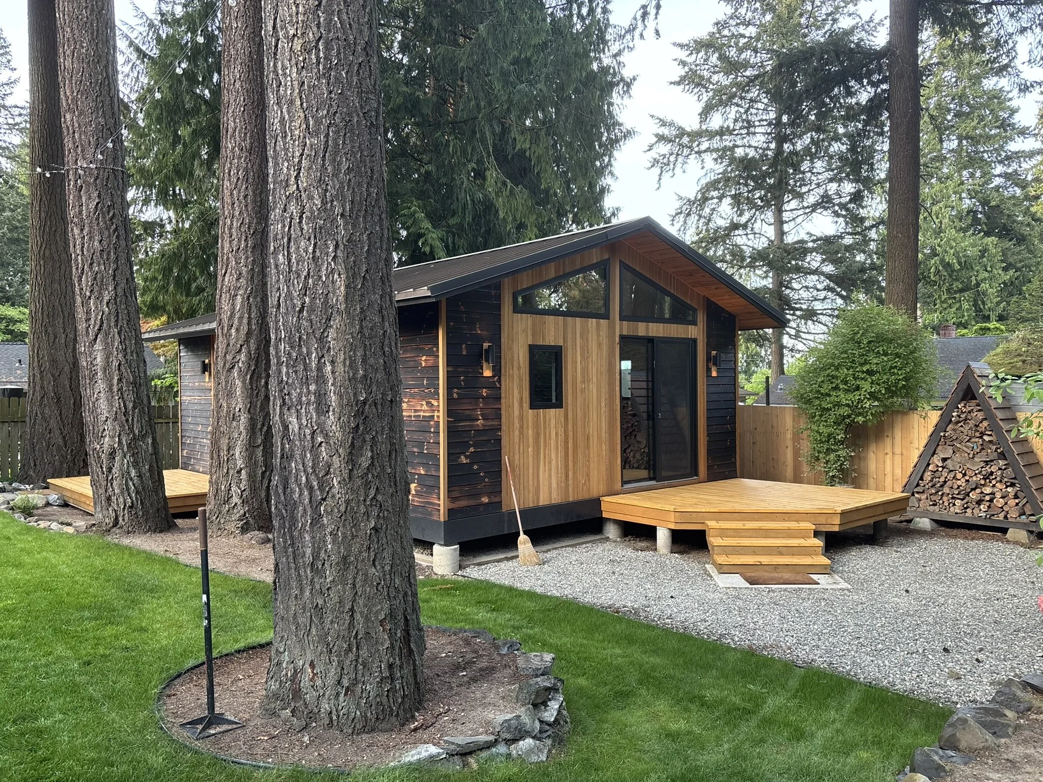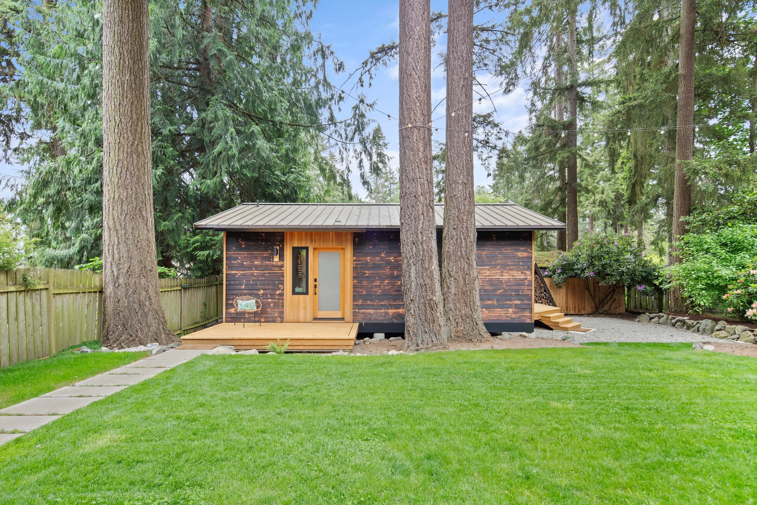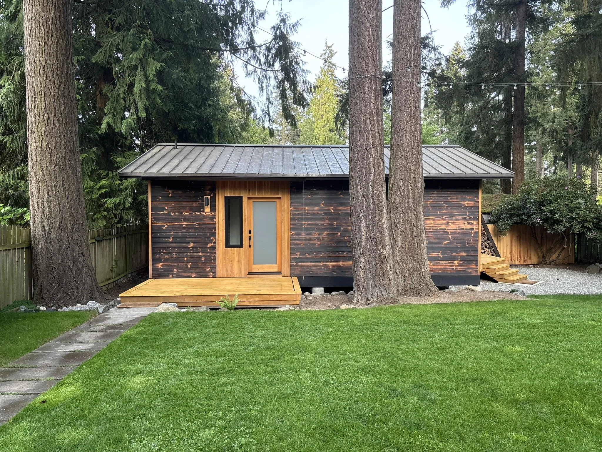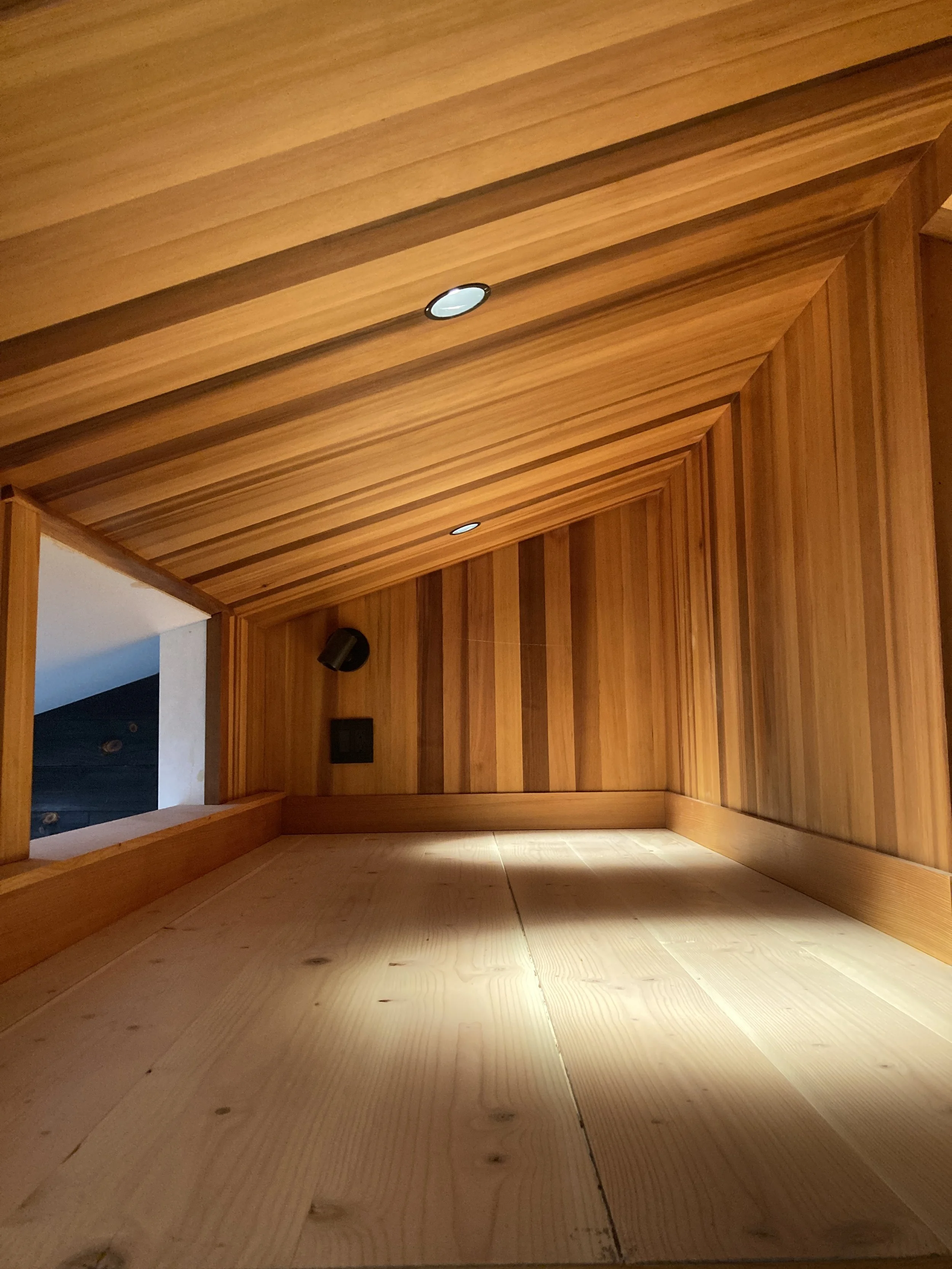 Tucked beneath a canopy of fir trees, Lake Forest Cottage is a small dwelling that feels expansive — a remnant renewed. What once was a weathered outbuilding is lifted lightly above the ground, resting on piers that respect the roots and rhythm of the site. Within its compact frame the ceiling rises, light gathers, and space unfolds in layers. The building actively breathes through its mechanical system exchanging air, capturing warmth, and conserving energy with quiet precision. Shou-sugi-ban and cedar wrap the exterior in shadow and glow, their textures recalling both craft and nature. Inside the central hallway, clad in clear cedar, invites touch and smooth walls radiate the shifting daylight. The cottage lives gently on its site offering a sense of calm and refuge, where small becomes generous and simplicity feels profound.