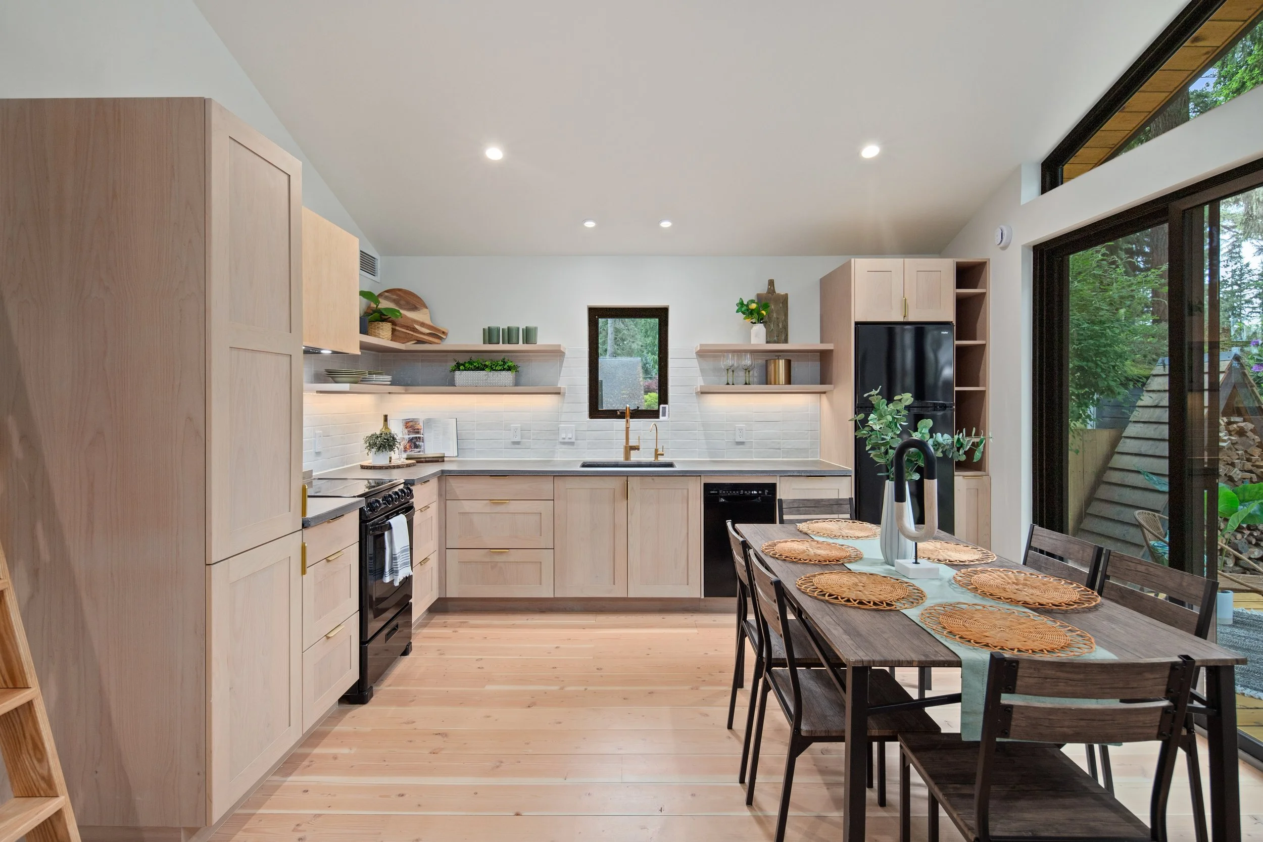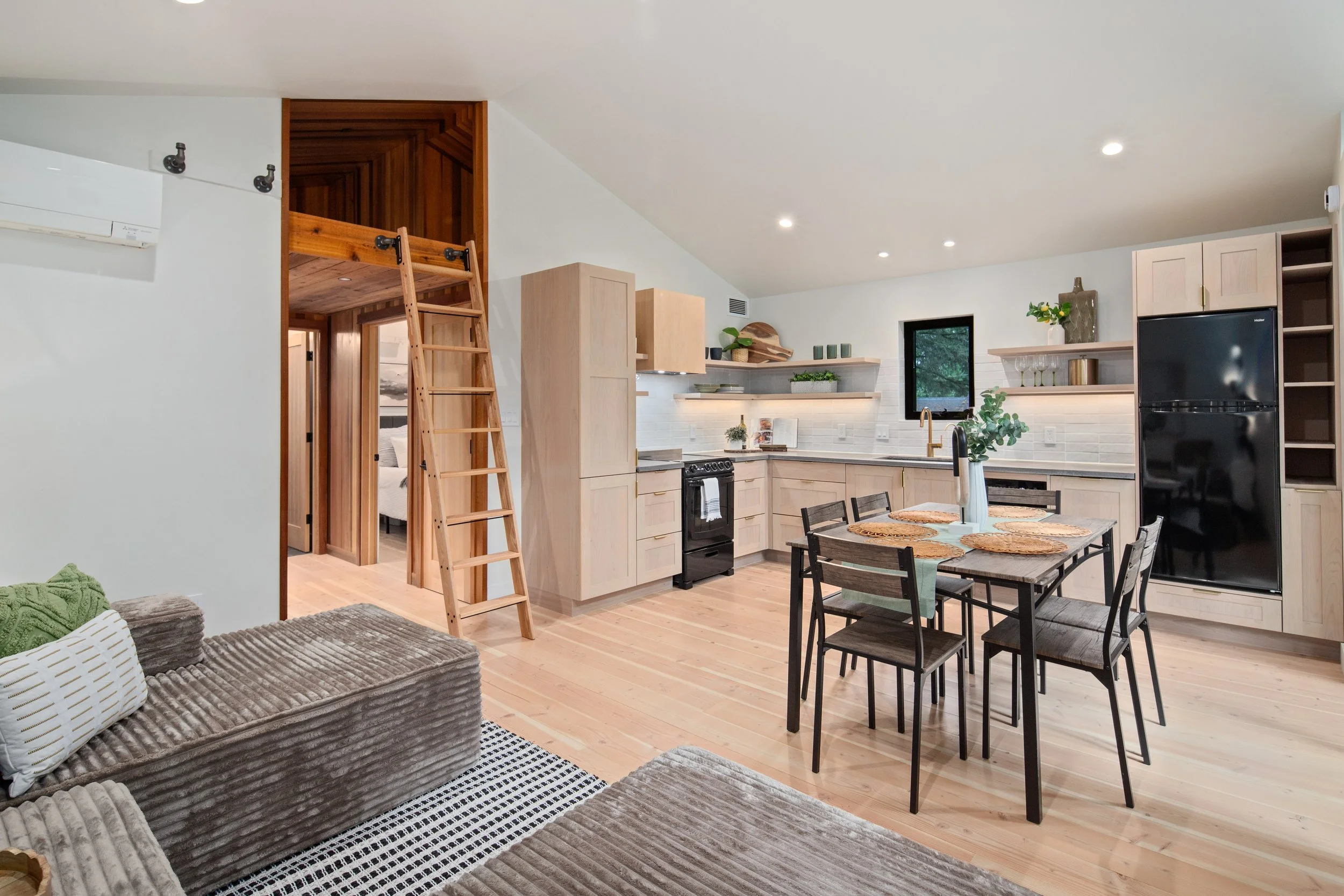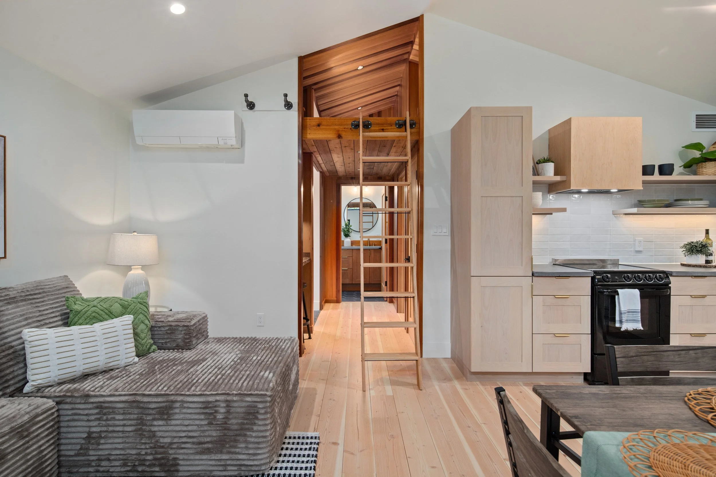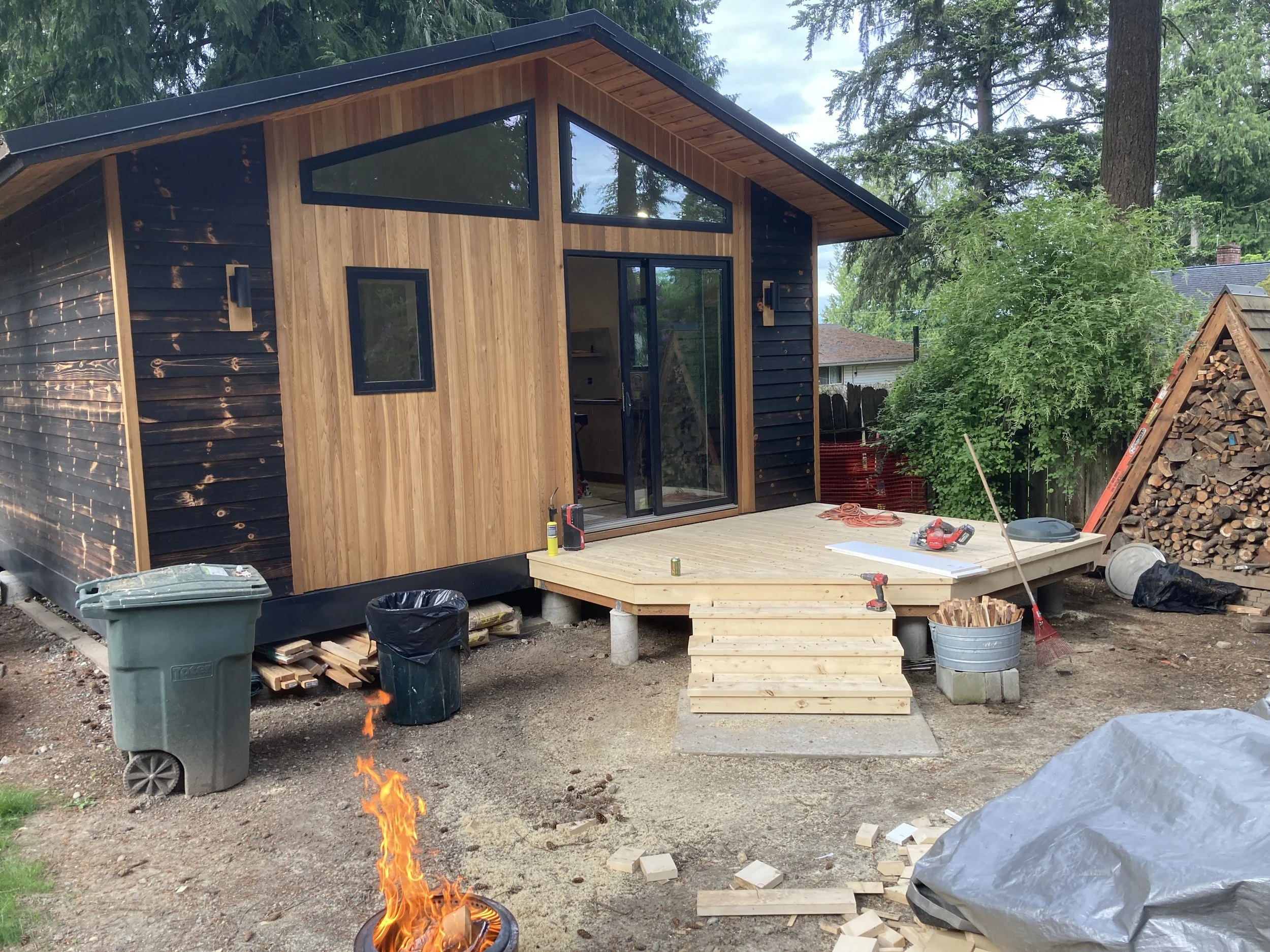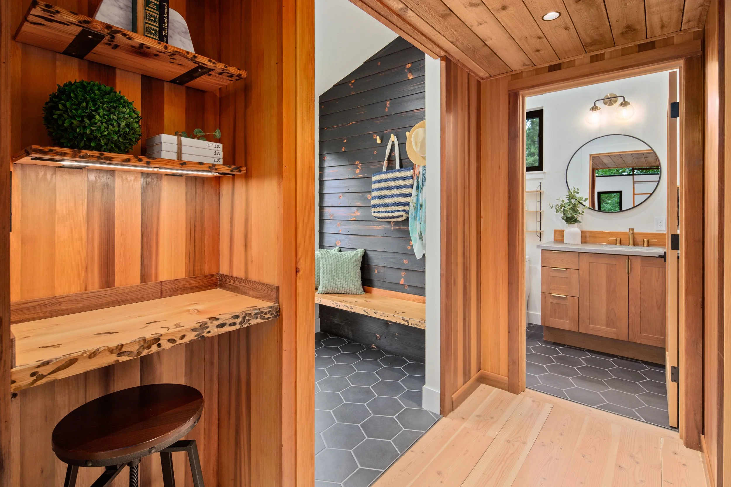 Tucked beneath a canopy of fir trees, Lake Forest Cottage is a small dwelling that feels expansive — a remnant renewed. What once was a weathered outbuilding is lifted lightly above the ground, resting on piers that respect the roots and rhythm of the site. Within its compact frame the ceiling rises, light gathers, and space unfolds in layers. The building actively breathes through its mechanical system exchanging air, capturing warmth, and conserving energy with quiet precision. Shou-sugi-ban and cedar wrap the exterior in shadow and glow, their textures recalling both craft and nature. Inside the central hallway, clad in clear cedar, invites touch and smooth walls radiate the shifting daylight. The cottage lives gently on its site offering a sense of calm and refuge, where small becomes generous and simplicity feels profound.