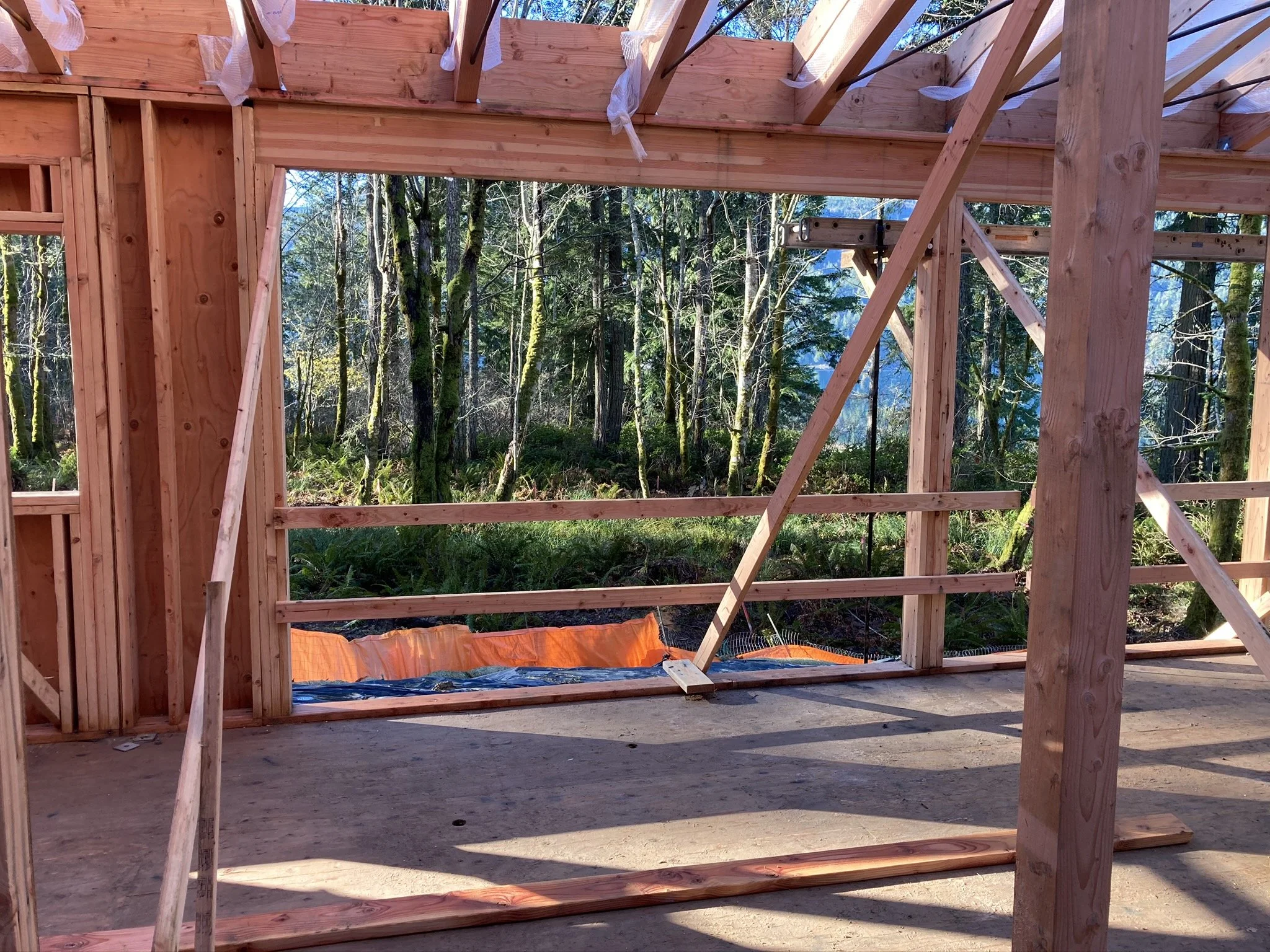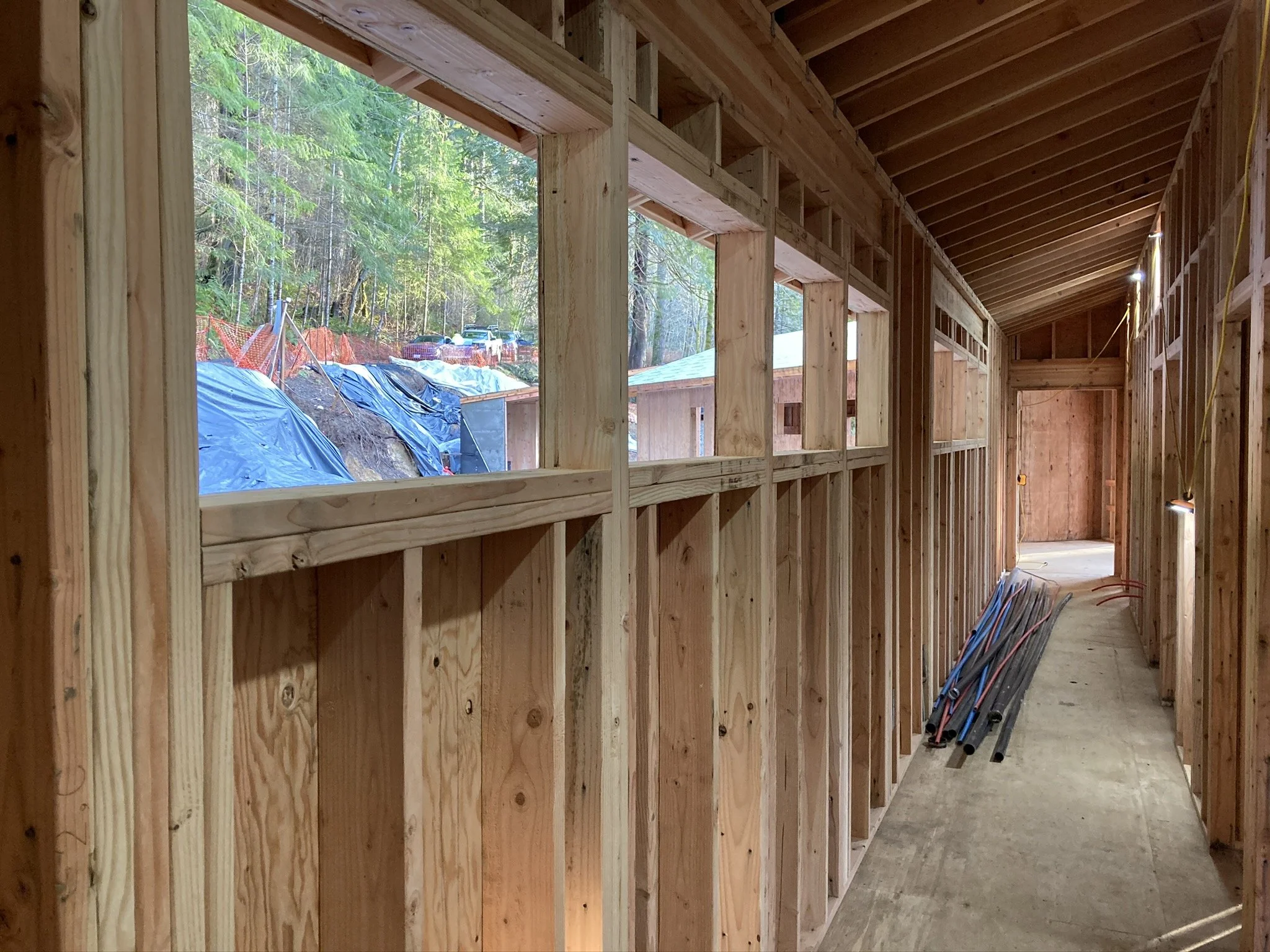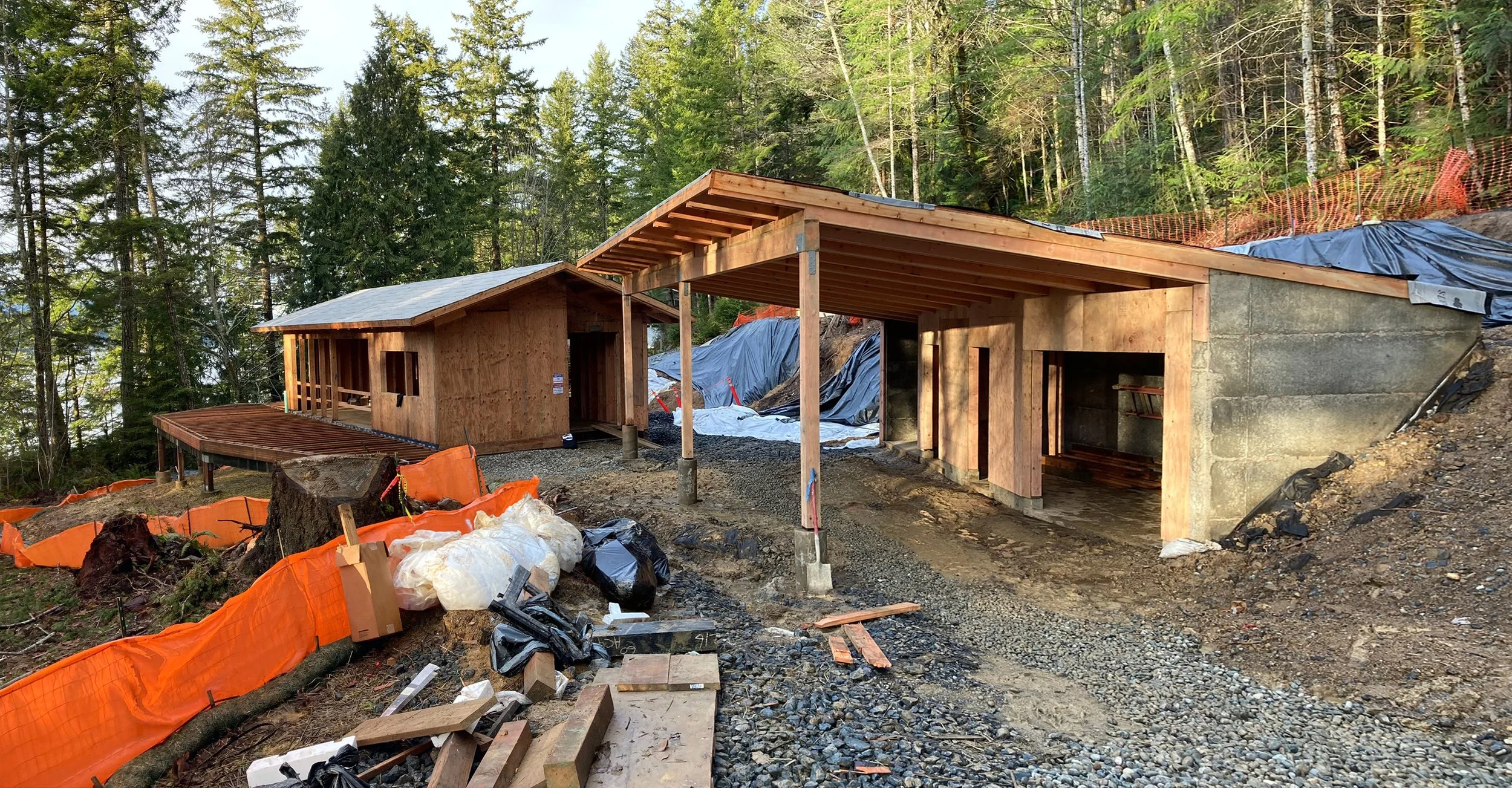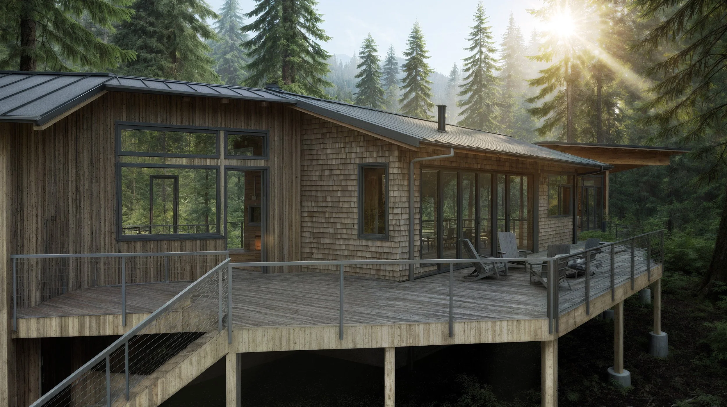 Tucked into the forested hillside above Dabob Bay, this family cabin rests quietly among filtered light and cedar shade. The home unfolds as a single story stretched along the contours of the land, shaped as much by constraint as by opportunity. Set back from the site’s natural wetlands its form follows contour and canopy, honoring what is already there. From the entry, the forest gives way to light — a framed view across the forest floor to the bay beyond can be enjoyed from a large deck that hovers above the slope; a place to linger. Outside sentiments of traditional northwest cabins are echoed by cedar shingle siding, while inside exposed rafters trace the rhythm of the roof. Materials of cedar, fir, and oak soften the structure giving warmth to the clean lines within. Here, design listens to the site — not imposing upon it, but growing from it — a home where simplicity meets reverence for the land.