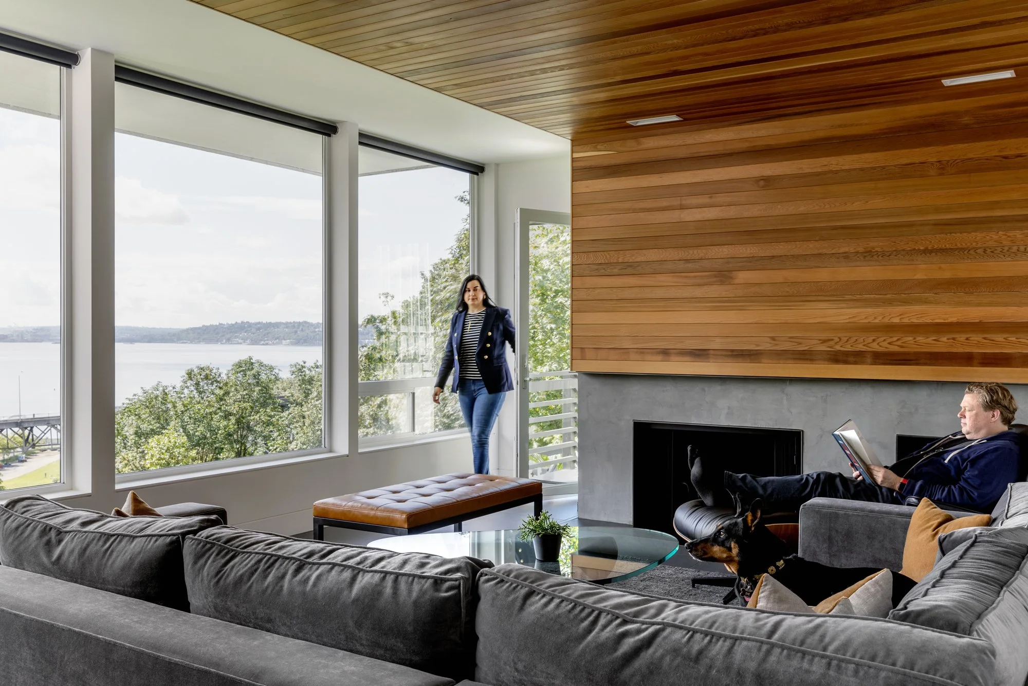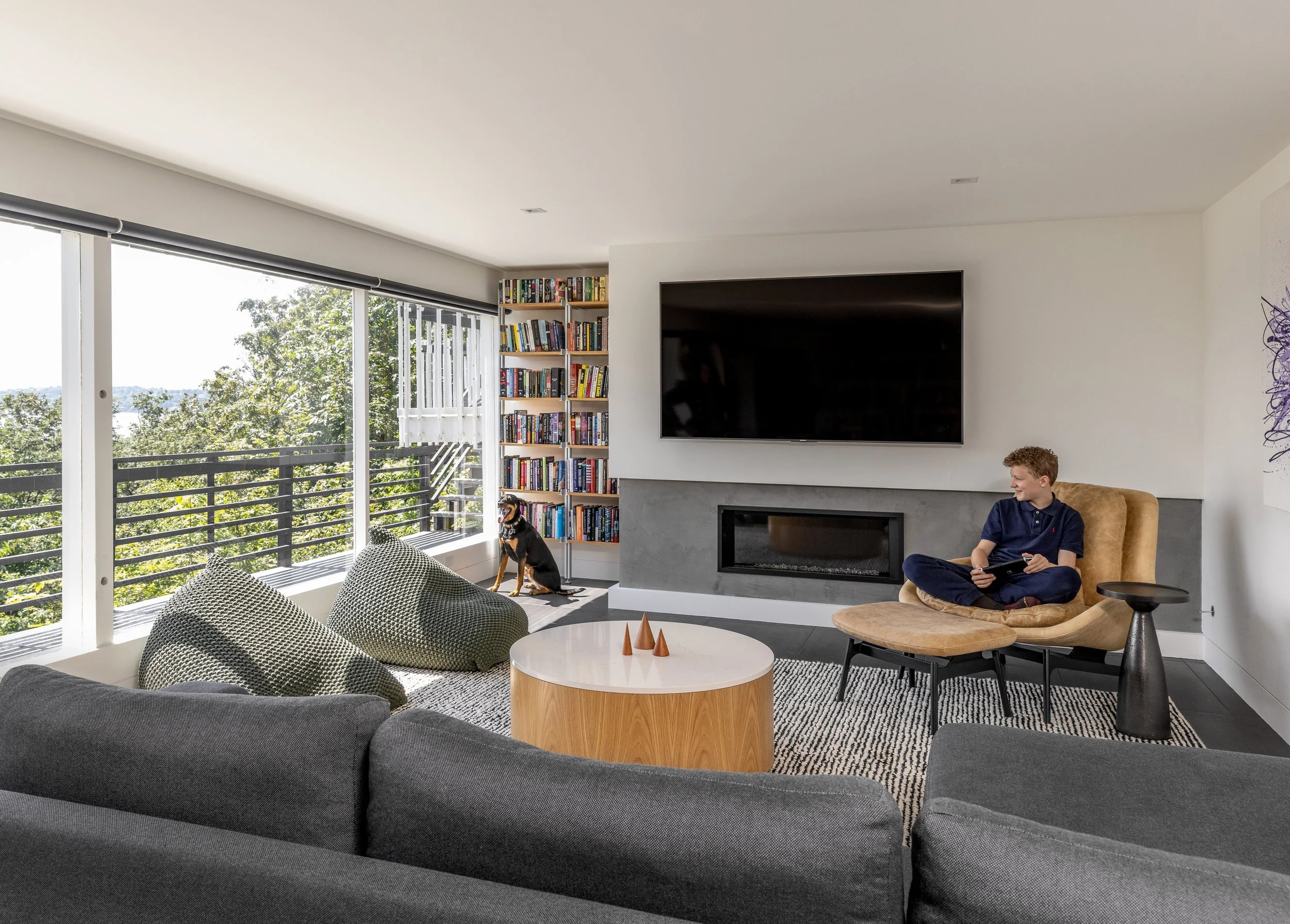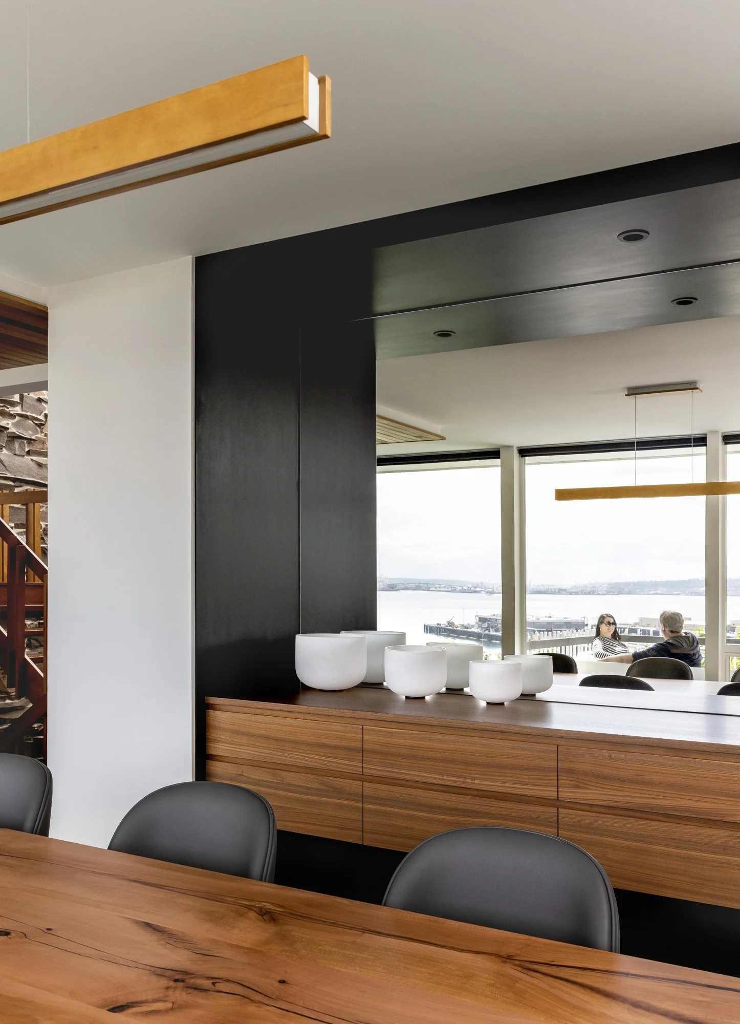 Perched above The Sound, Tesseract unfolds as a study in geometry and light. The remodel honors the clarity of the original mid-century structure, preserving its broad horizon of glass and view, while reimagining the spaces within. Walls that once divided are opened, allowing volumes to flow, to bend, to fold into one another. Planes of material fold across walls and ceilings, wrap casework and countertop, like ribbons invoking movement through space. Materials shift from smooth to tactile — lightly finished walls meet wood and Richlite in soft contrast. Beneath it all radiant floors work quietly, warming a home that feels both renewed and familiar. Tesseract transforms the act of dwelling into an unfolding experience of space made dynamic, precise, and alive.