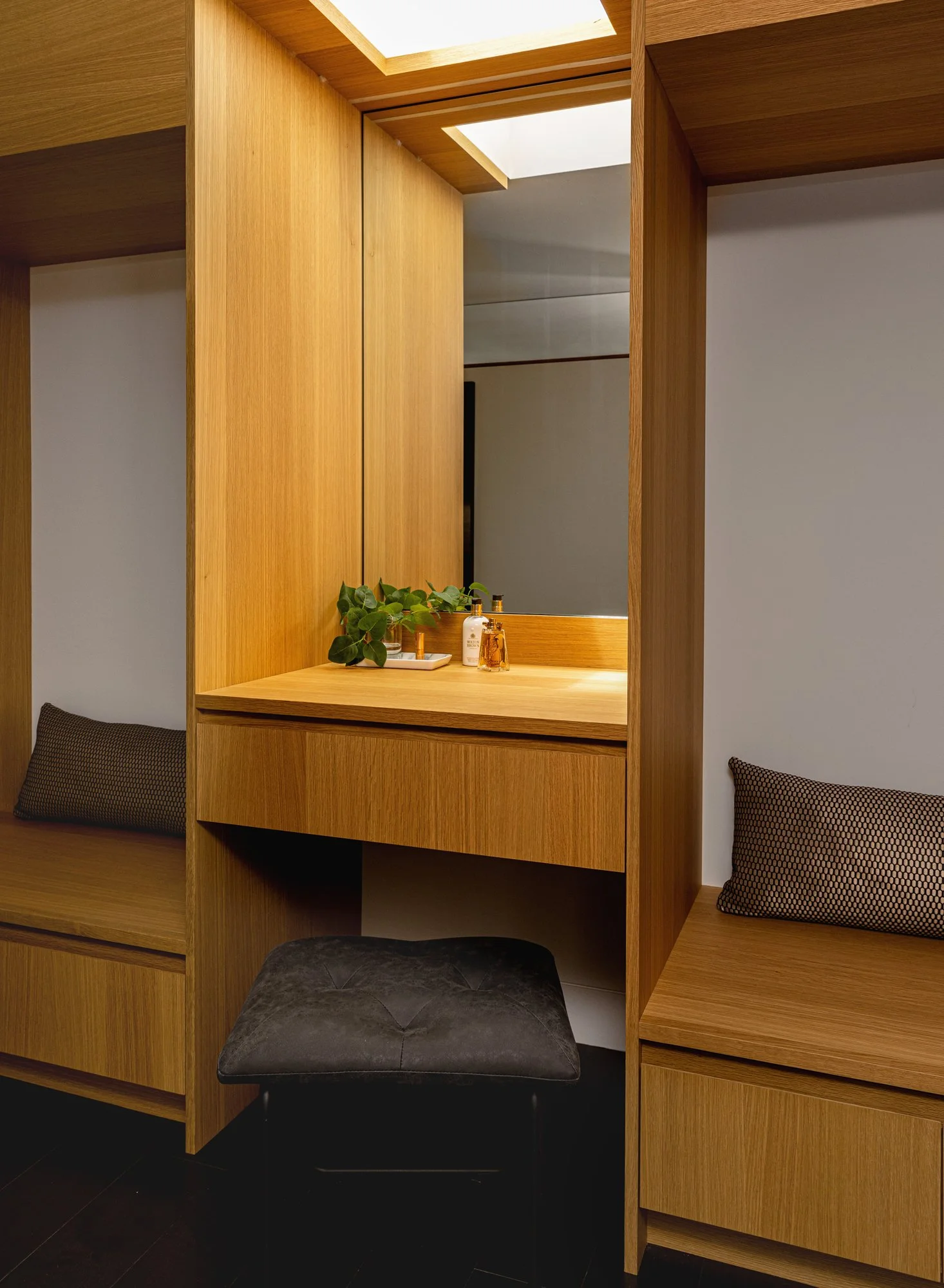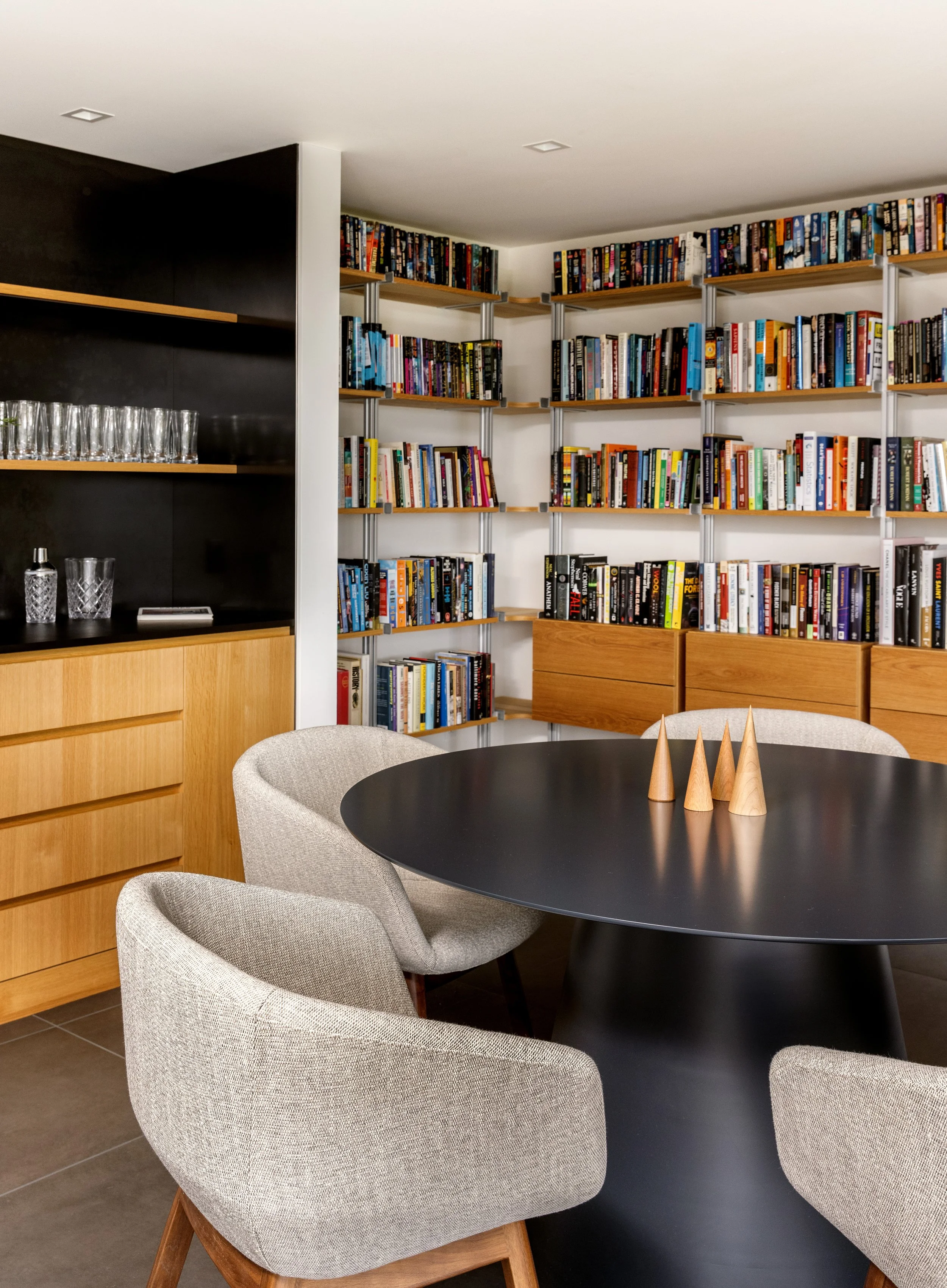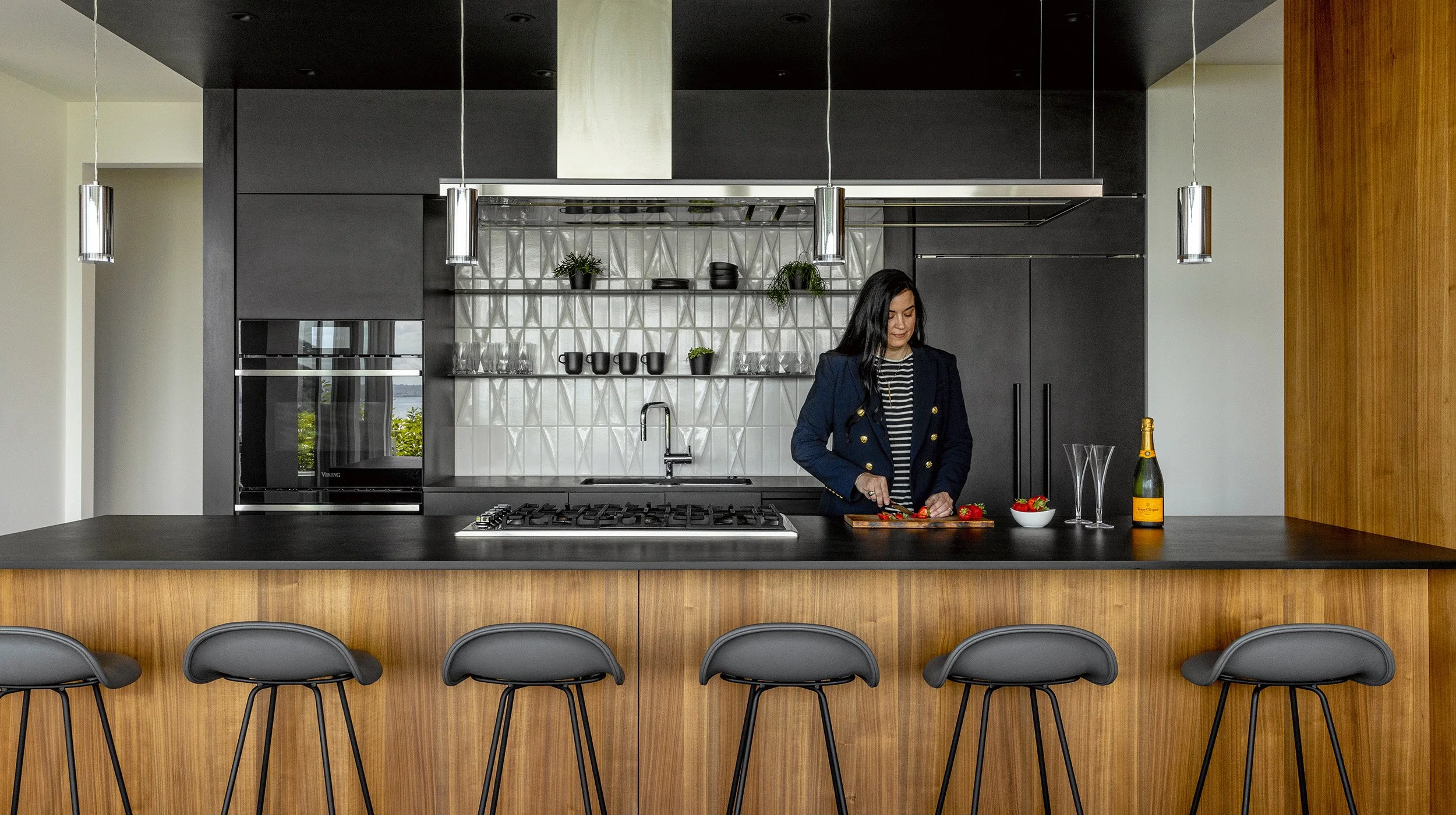 Perched above The Sound, Tesseract unfolds as a study in geometry and light. The remodel honors the clarity of the original mid-century structure, preserving its broad horizon of glass and view, while reimagining the spaces within. Walls that once divided are opened, allowing volumes to flow, to bend, to fold into one another. Planes of material fold across walls and ceilings, wrap casework and countertop, like ribbons invoking movement through space. Materials shift from smooth to tactile — lightly finished walls meet wood and Richlite in soft contrast. Beneath it all radiant floors work quietly, warming a home that feels both renewed and familiar. Tesseract transforms the act of dwelling into an unfolding experience of space made dynamic, precise, and alive.