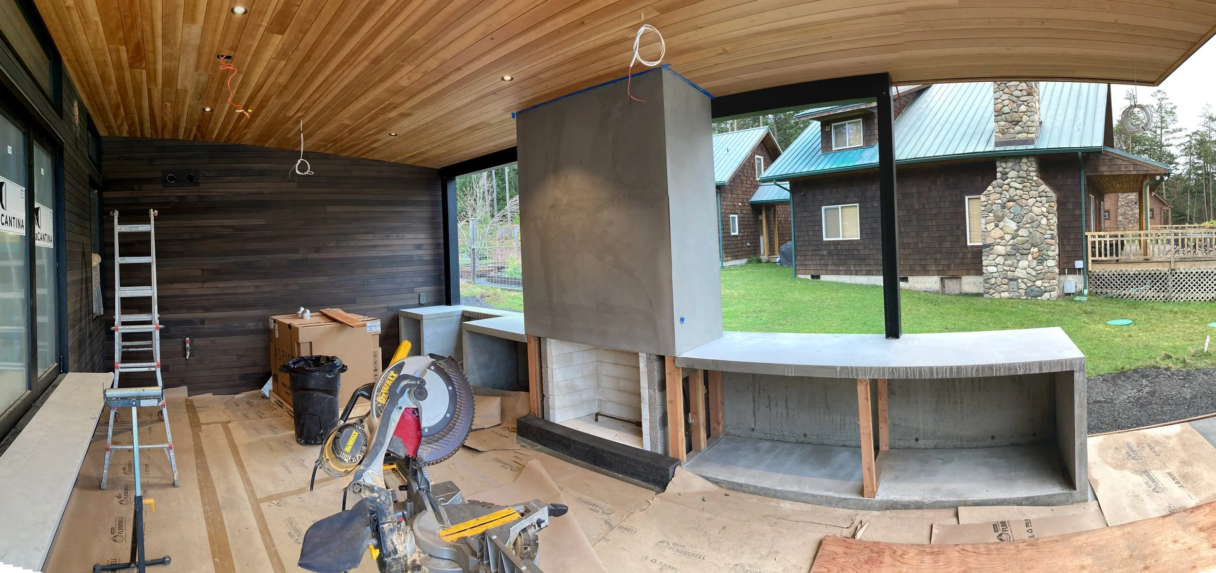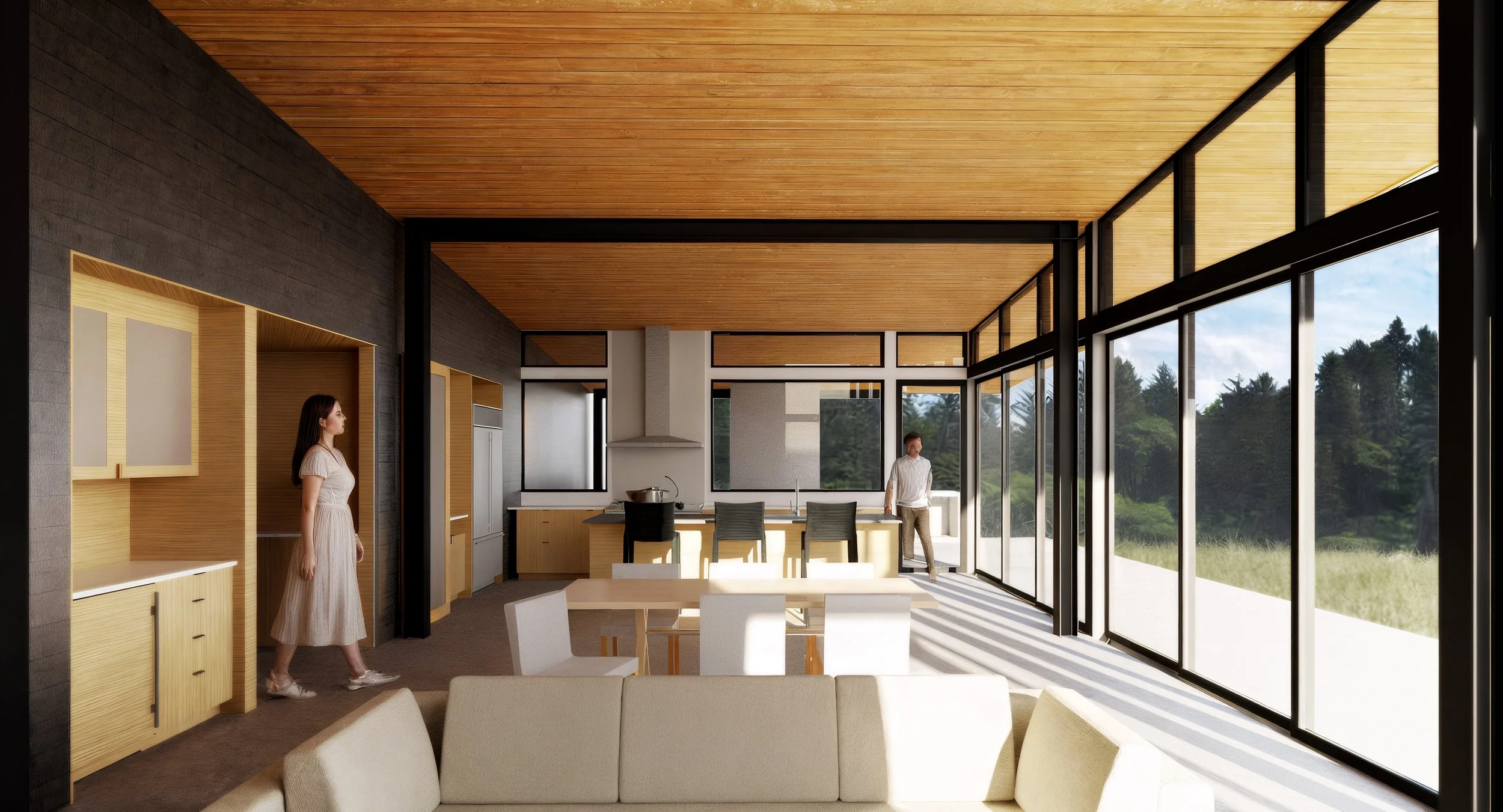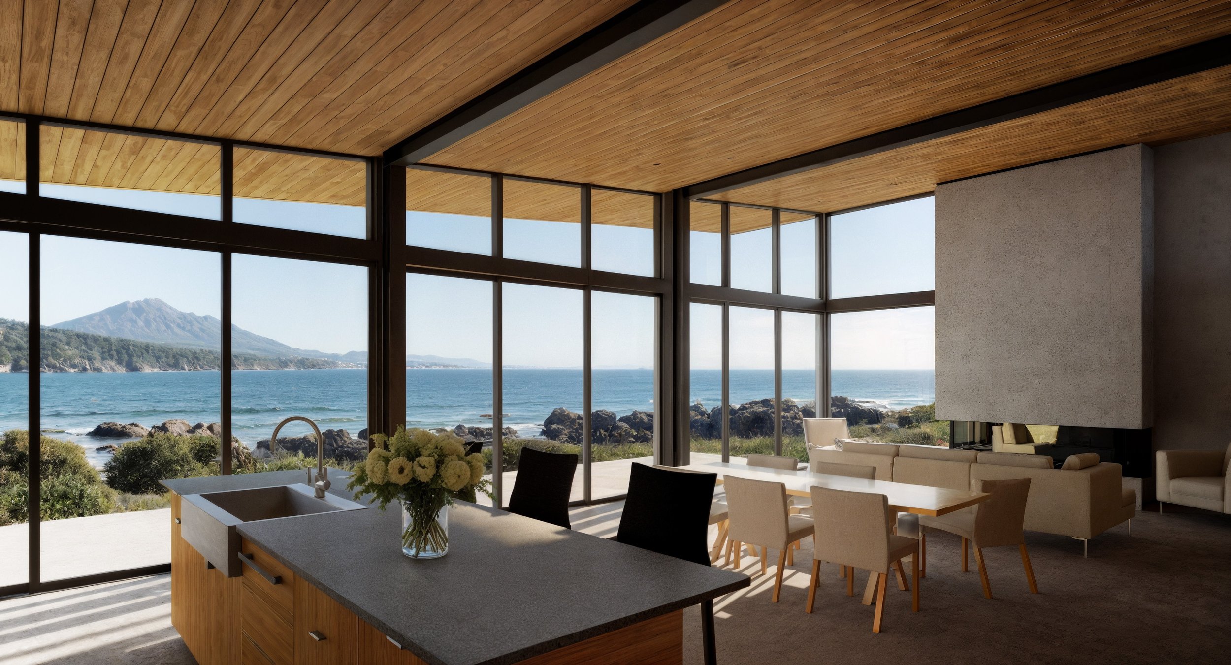 Approached beneath towering cedars, Yacht Haven appears quietly between trees and sky. The house rests low in a natural clearing, its form unfolding toward the water. Two wings frame an intimate courtyard, guiding visitors through a moment of stillness before the house opens wide to The Sound. Inside, the architecture stretches toward the horizon — glass, steel, and wood converging beneath a sweeping roof that shelters both home and patio in one gesture. Dark cedar cladding grounds the exterior in light shadow, while the interior glows with the warmth of cedar and Shou-sugi-ban. Each detail balances refinement with restraint, from the radiant concrete floors to the jewel-like tiled baths. The home reaches outward to the sea yet feels anchored to the land — a retreat both humble and grand.