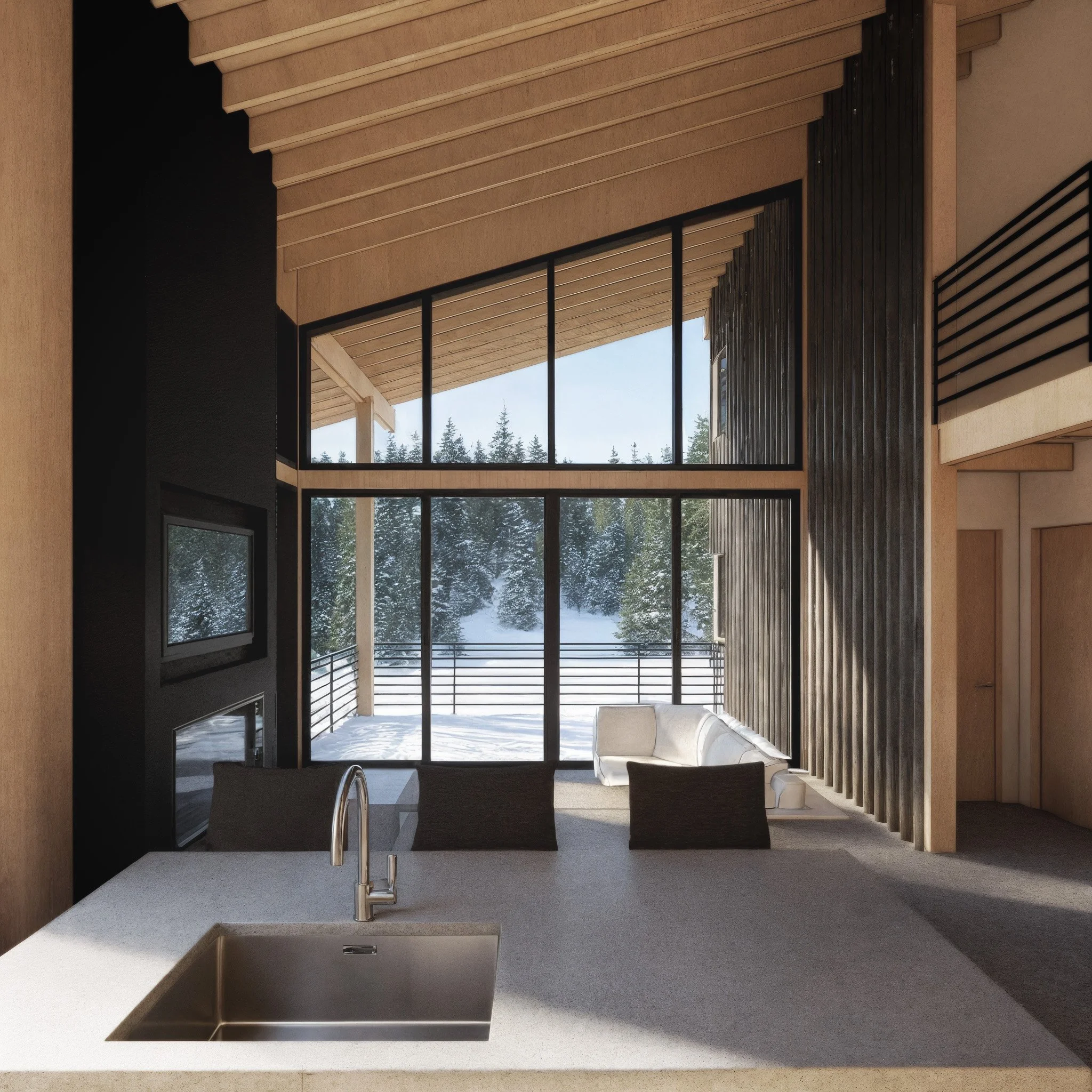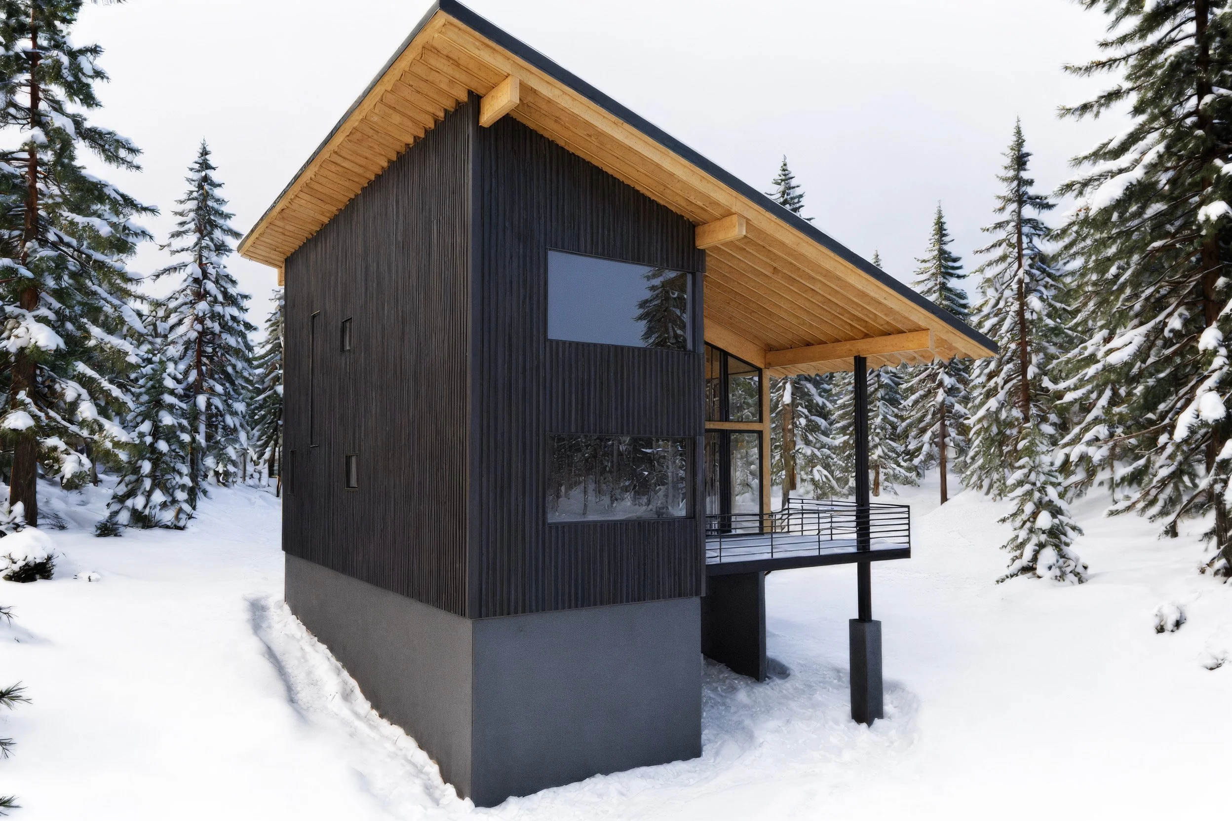 High in the Cascades, Yodelin Cabin rises from the snow as a warm lantern among the trees. A bridge leads to its door, crossing from wilderness into calm. Lifted above the forest floor, the cabin watches the mountains and weathers the seasons, its metal skin a quiet armor against wind and snow. Inside the rhythm of exposed rafters traces the slope of the roof, framing light that filters through tall spans of glass. Fir and cedar line the walls, their warmth gathering around the hearthlike core. Spaces shift and overlap — a place to rest, to return, to look outward again. Simple in form yet rich in experience, Yodelin Cabin is both shelter and outlook, a small mountain refuge designed for endurance and repose.